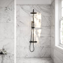 Our exposed thermostatic matte black shower with riser is the perfect addition for a modern bathroom look. Paired with one of our stone baths or shower enclosures, this unique system is a must-have for an on trend aesthetic. Featuring both an adjustable handset and a overhead drencher, this innovative matte black shower is highly versatile too. Made with high quality components, including Vernet cartridge and thermostatic technology for a precision stable temperature. Our exposed matte black shower is made from commercial grade quality materials for a long lasting design.