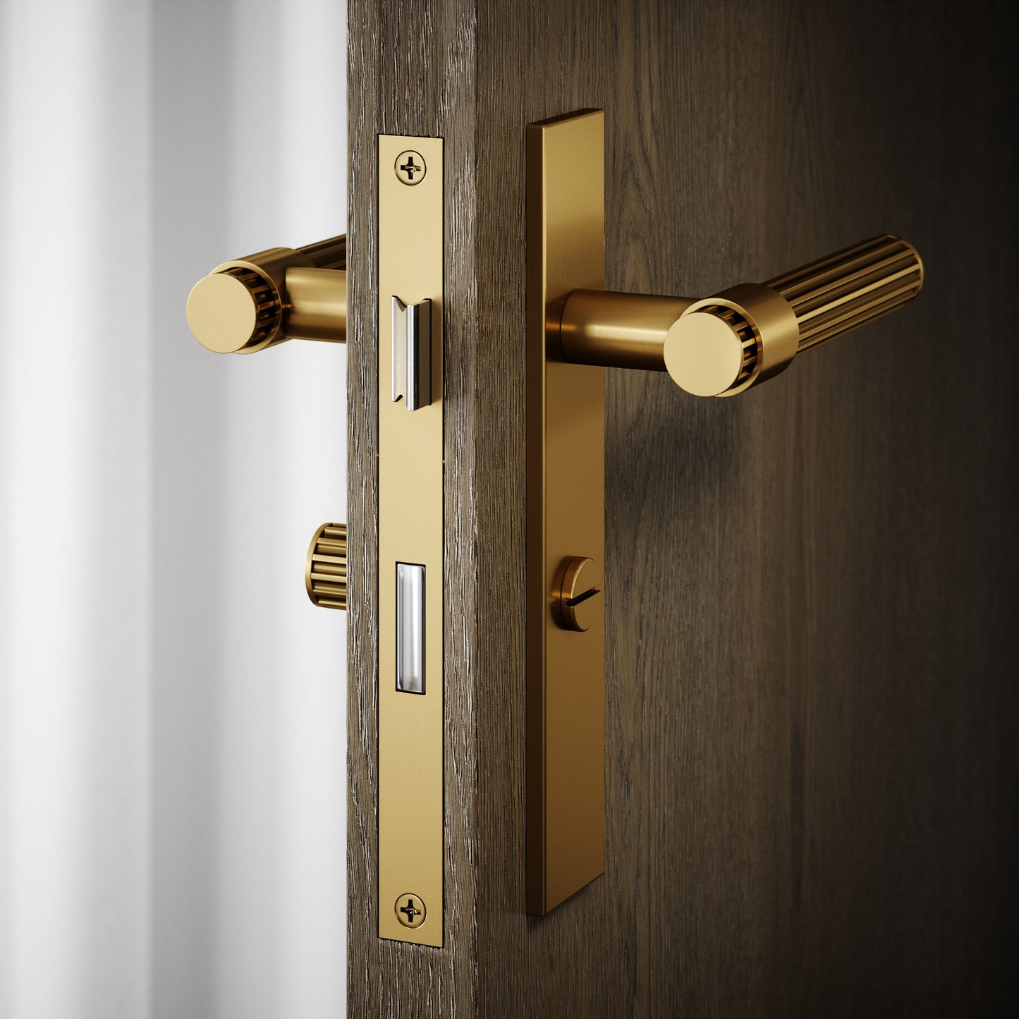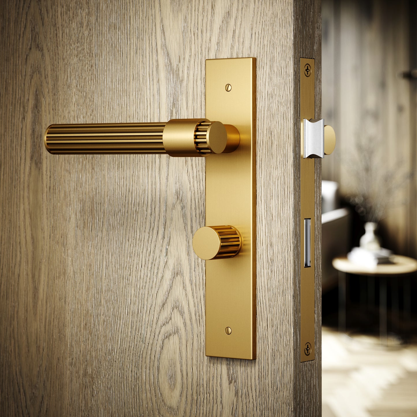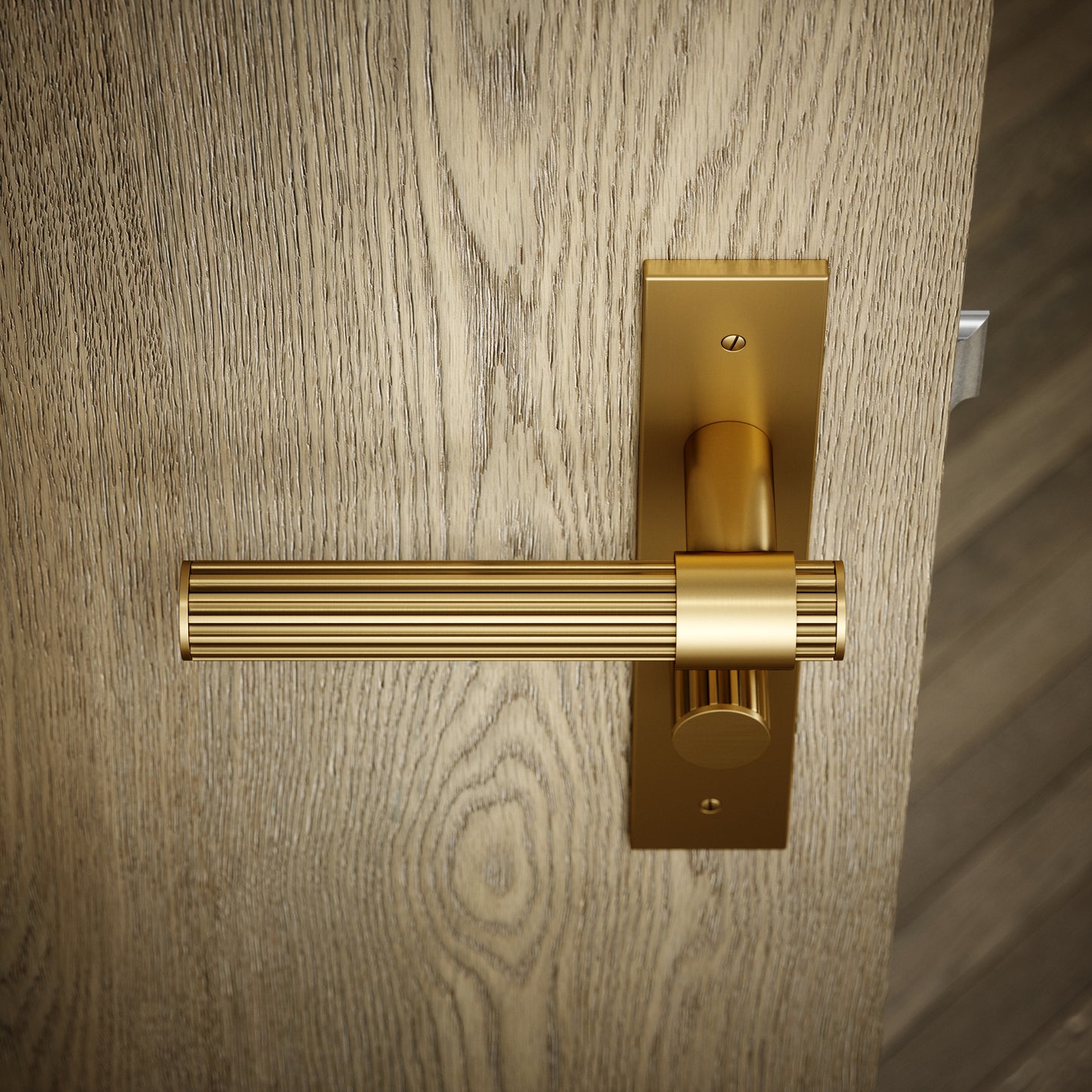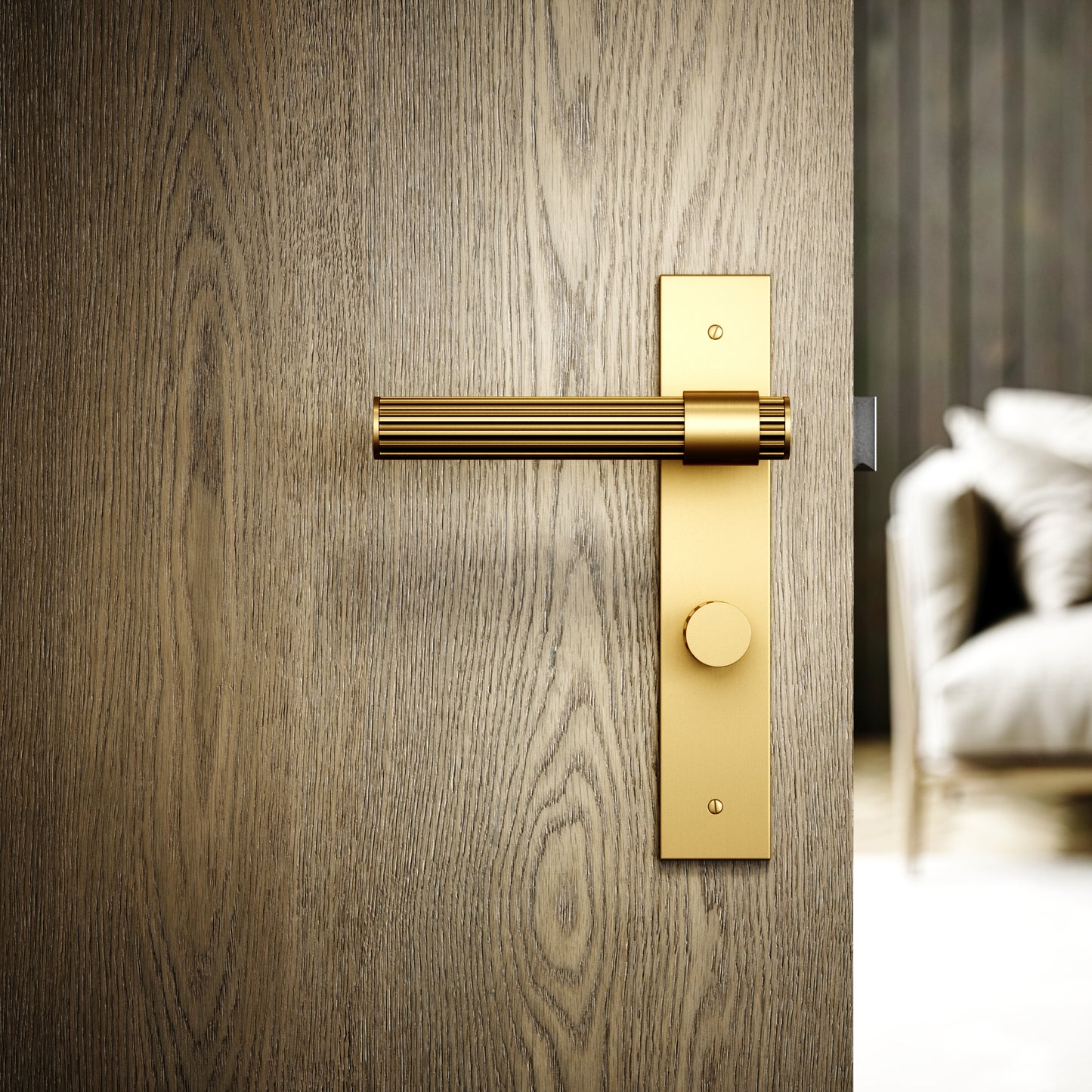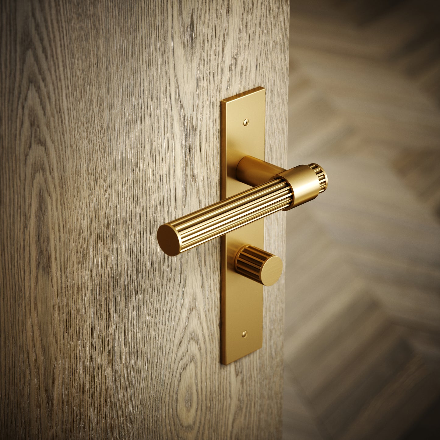 The Royal Oak Brushed Gold Deep Flute Bathroom WC Handle & Plate Thumbturn Set is a practical lock and handle set to ensure privacy for your space, and is crafted to the highest of standards. The handle set is defined by its elegant fluted detailing which takes inspiration from ancient Greek and Roman architecture, offering a tactile impact for your doors.