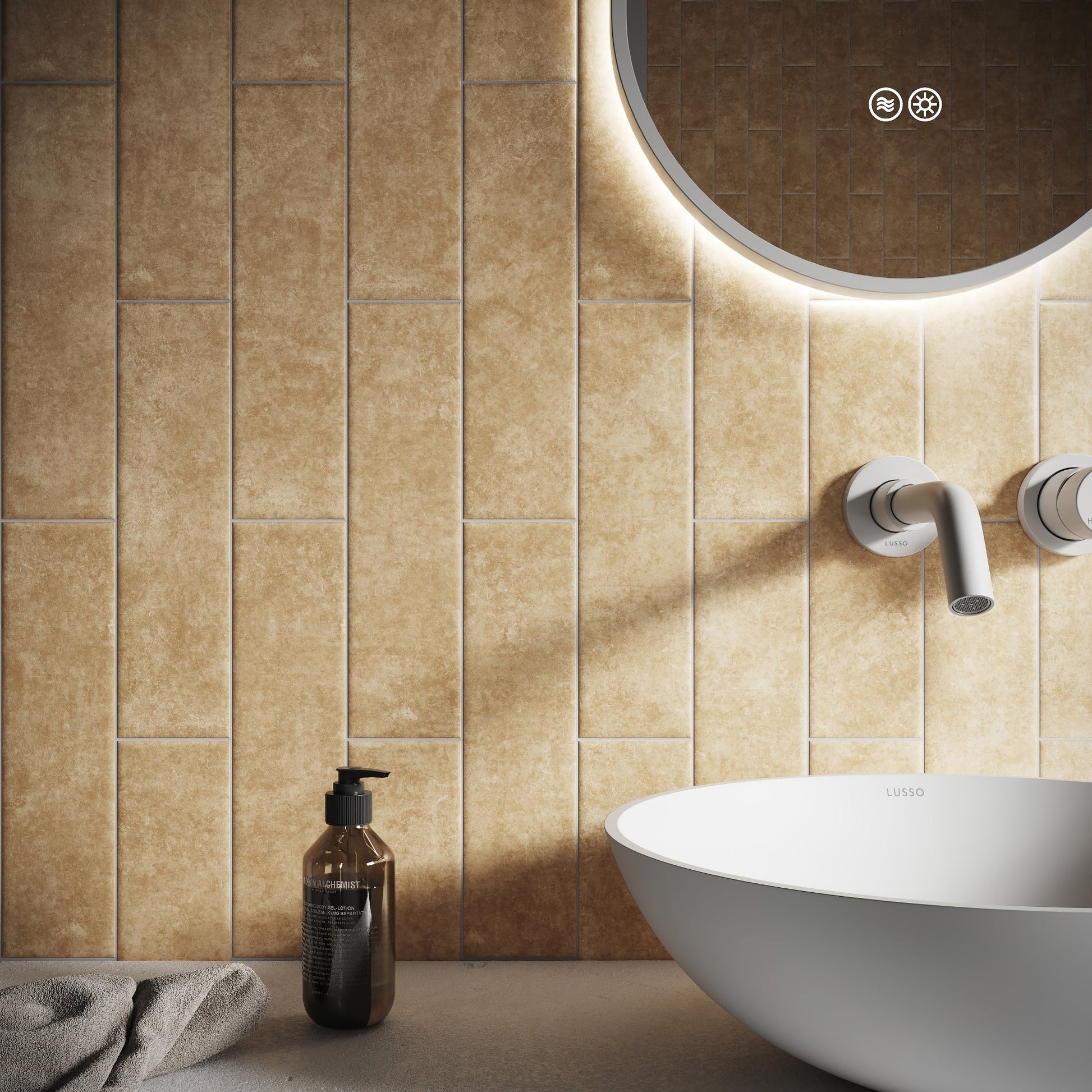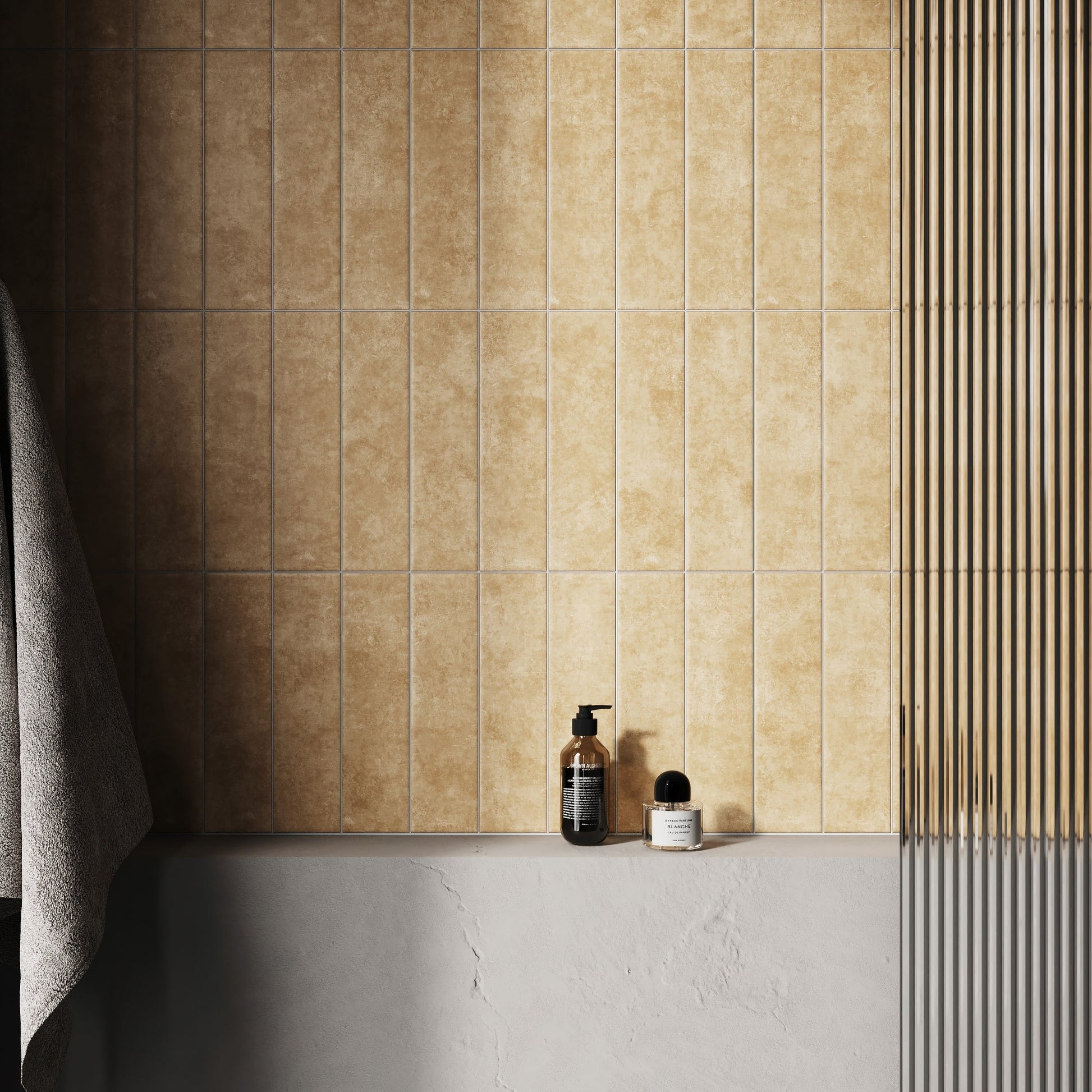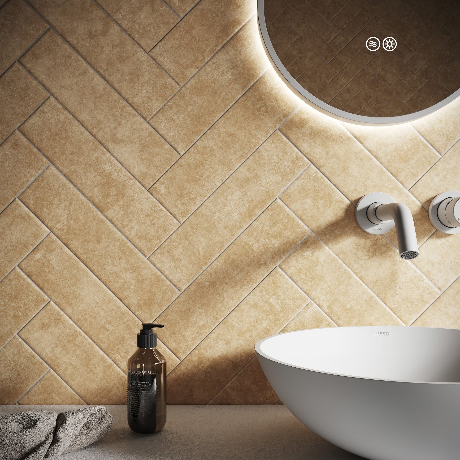 The Palma brick tile is inspired by the rustic elegance of Mediterranean architecture, featuring a handmade look and feel that adds character and warmth to any space. The softly textured surface replicates the organic finish of handcrafted ceramics, making each tile a unique work of art. Perfect for accent walls this tile brings a sense of understated luxury to your space. The neutral hue of the apricot bliss tile adds warmth and brightness, evoking the serene essence of the Mediterranean sun-kissed landscapes.