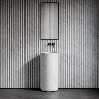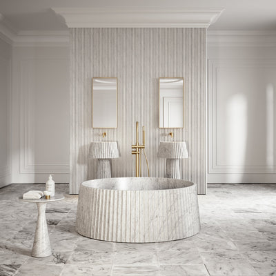 The vertical grooves of the fluted detail takes influence from architecture and decorative elements prominent in Greek design. The rarity and opulence of the Carrara marble combined with fluting offers unique character and a striking statement that can be set as a splashback or feature wall.