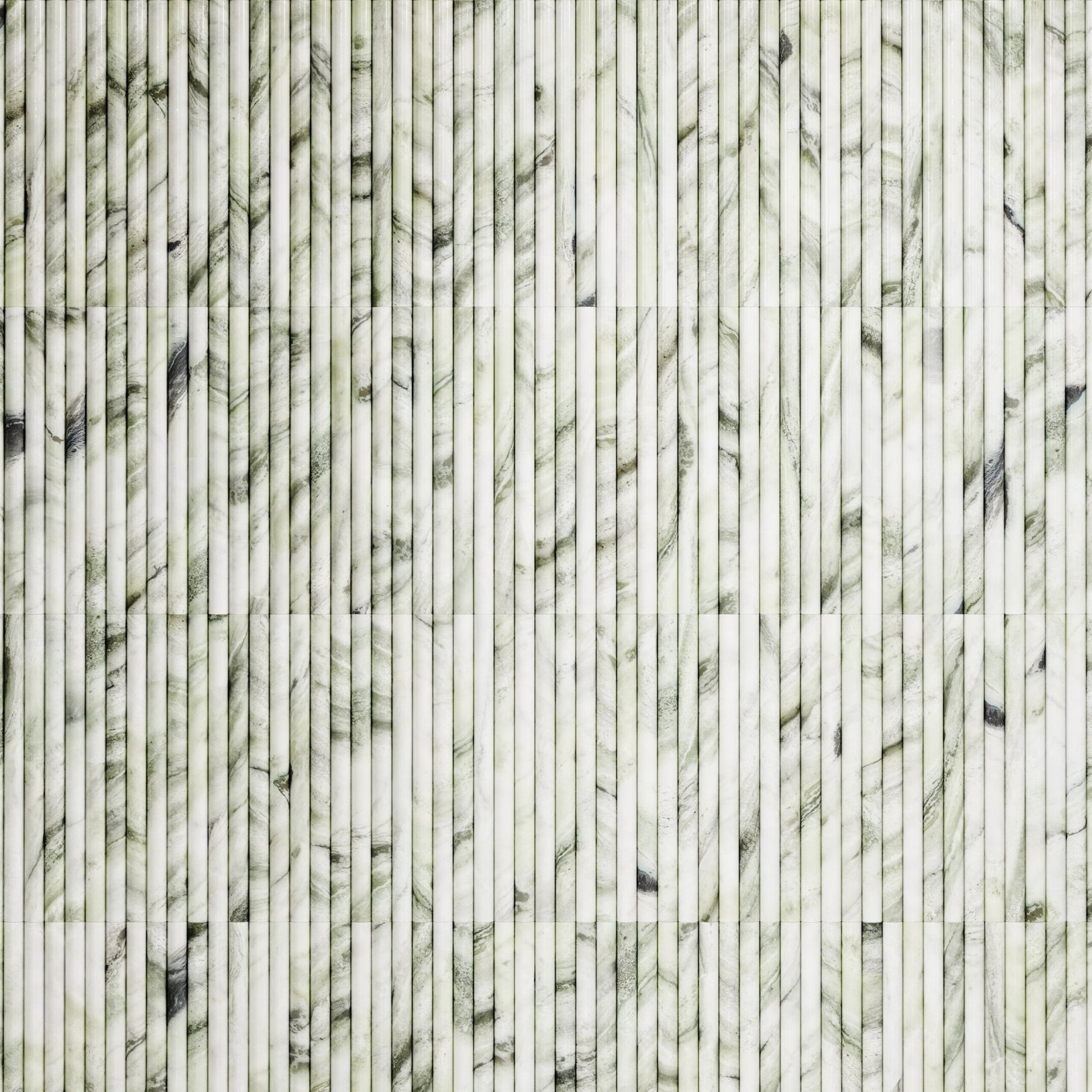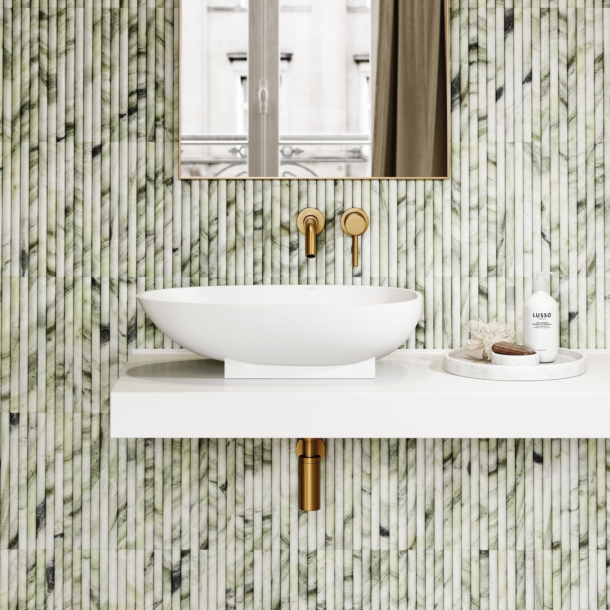 The Romano Jade Green Marble Fluted Tile defines unique luxury offering a sophisticated blend of natural beauty and remarkable craftsmanship. Handcrafted from a single block of the finest Jade Green marble, each tile is a unique masterpiece, with distinctive veining and markings that showcase the inherent beauty of the stone. No two pieces of marble are alike, making your space a truly bespoke interior.