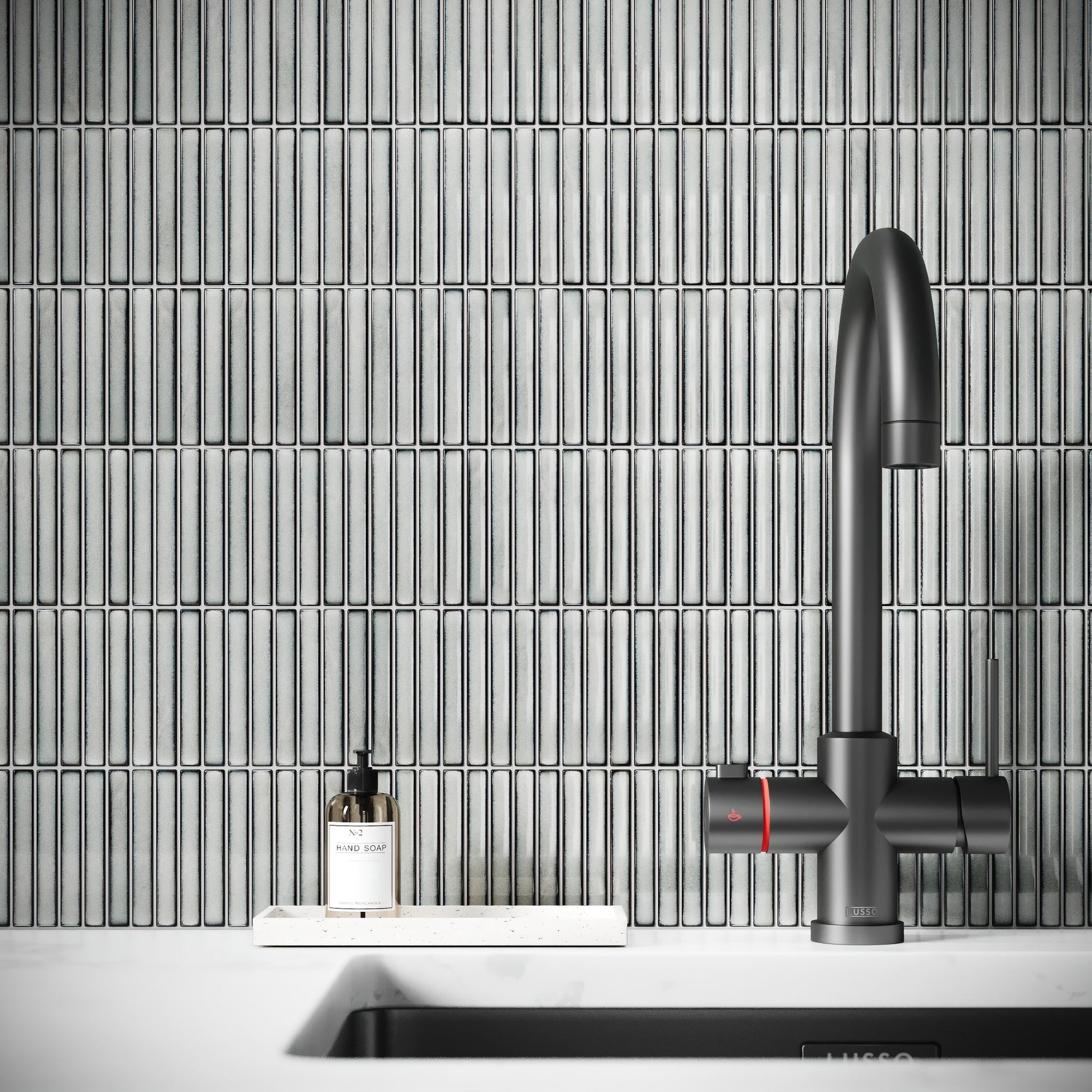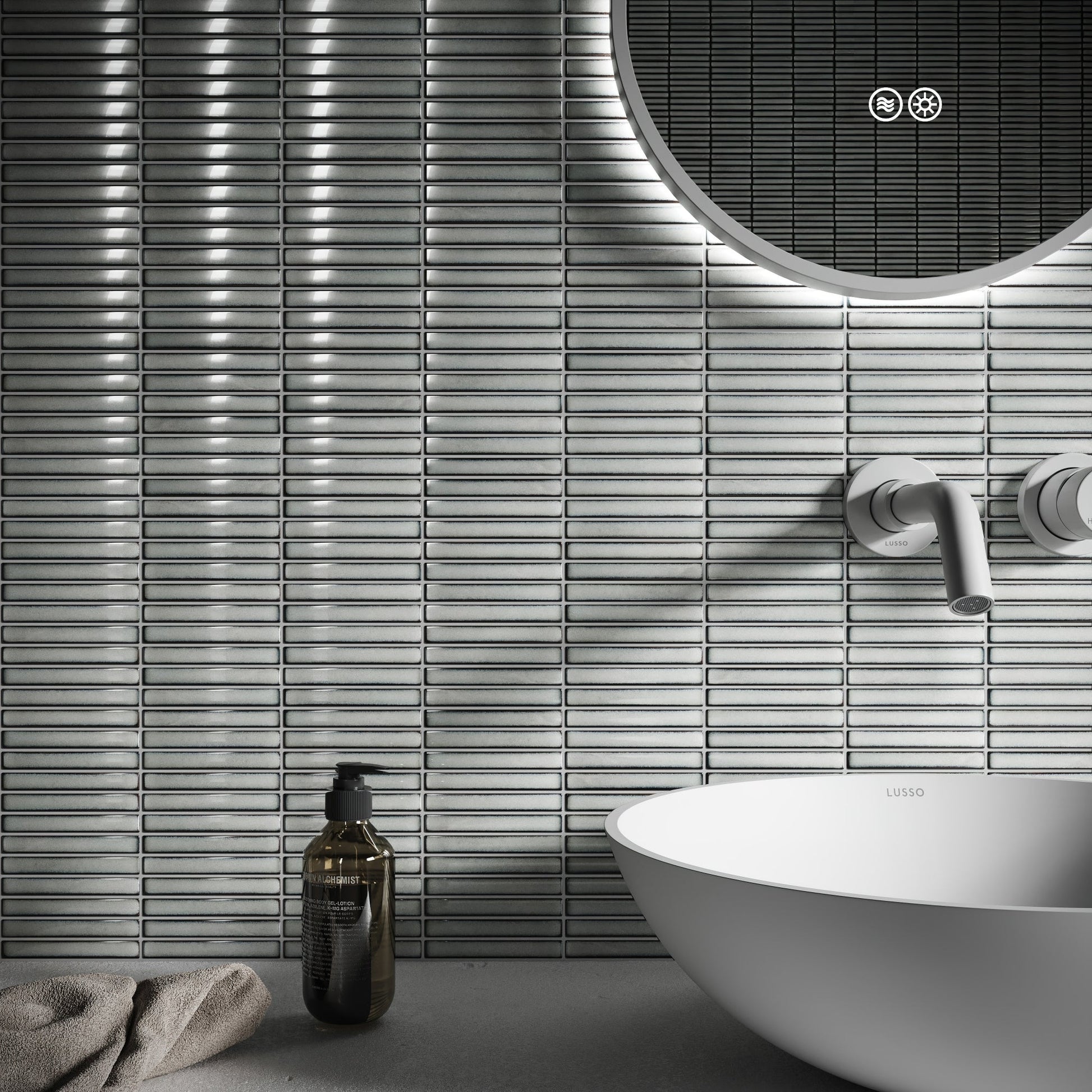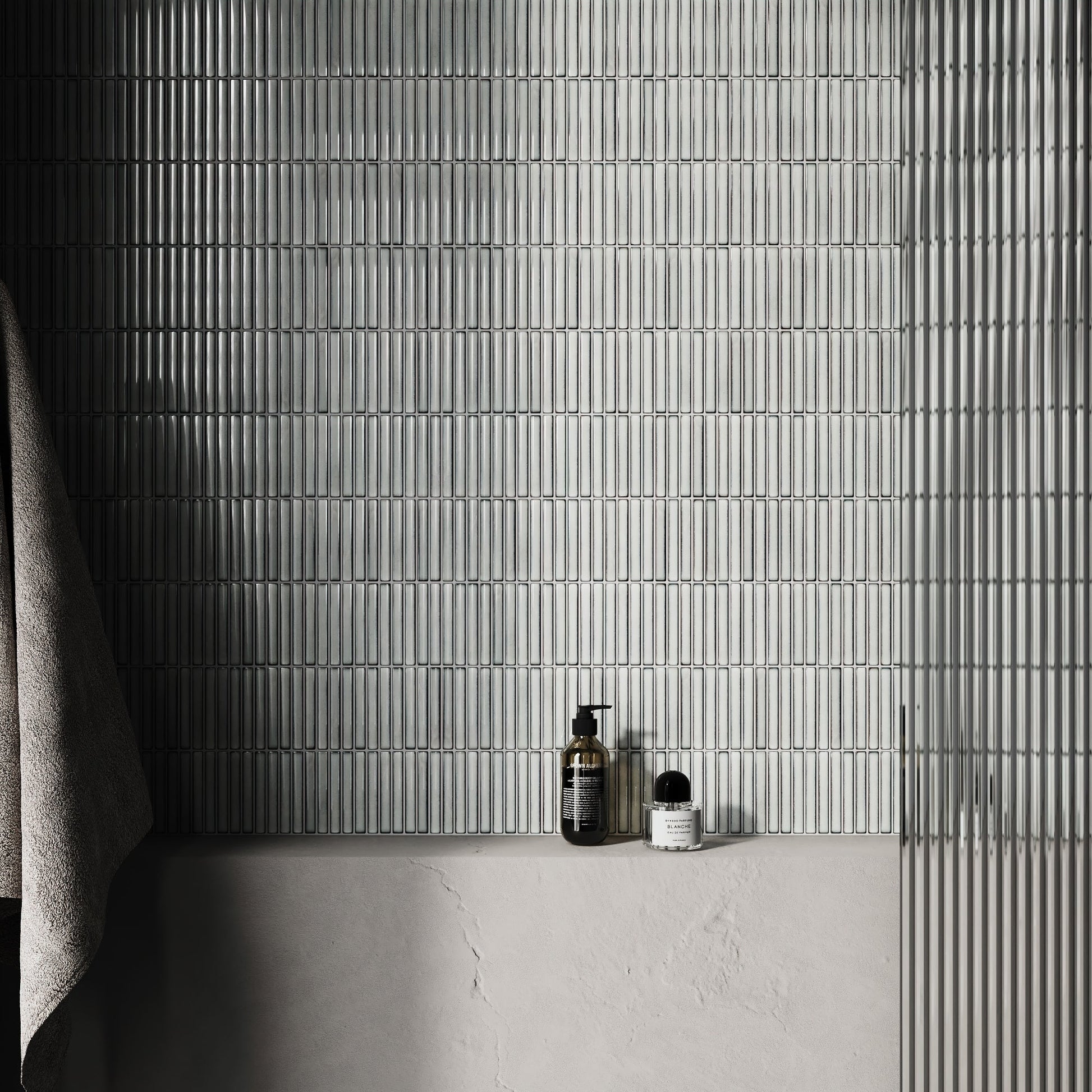 Crafted to be installed as a wall tile, the glazed tile is suitable for all spaces and is designed to add interest and character. The stick mosaic tile displays a textured look, with a lustrous gloss finish that enhances the beautiful soft shade of grey.