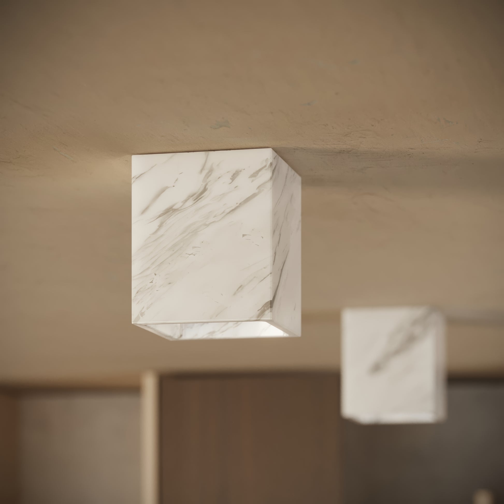 Presented in a refined square silhouette, the Mastro Volakas marble ceiling light brings a serene yet architectural presence to any environment. Its clean, linear form creates a modern canvas for the marble’s luminous white surface and soft grey veining, allowing the natural material to elevate both indoor and outdoor settings with understated luxury.