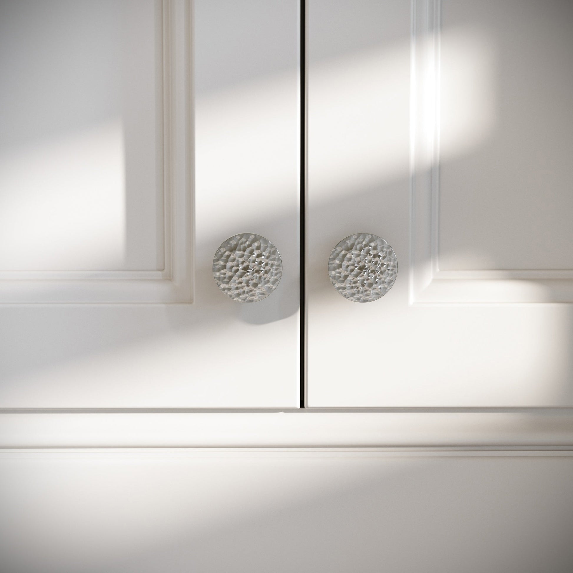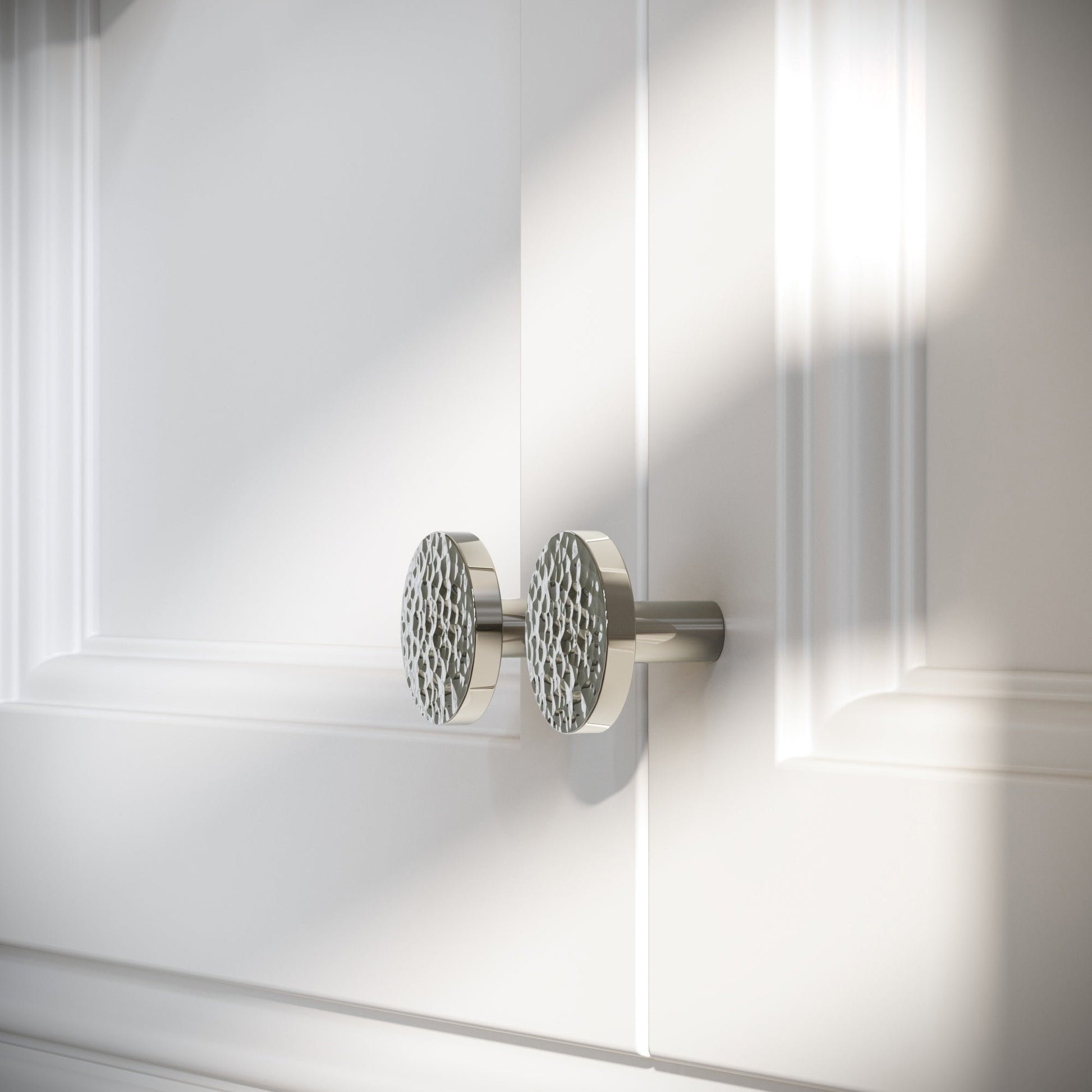 These cabinet knobs are defined by a hammered surface which creates a textured appeal, perfect for industrial, and minimalist interiors that want to add interest. Finished with an elegant polished nickel sheen.