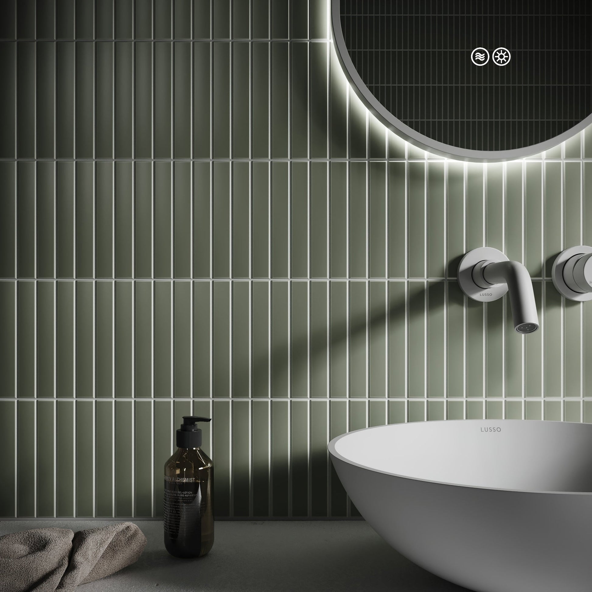 Finely crafted from porcelain, the wall tile displays a baton design influenced by the timeless style of subway tiles. The narrow, rectangular form blended with the neutral sage green tone allows you to create a beautiful feature wall or splashback.