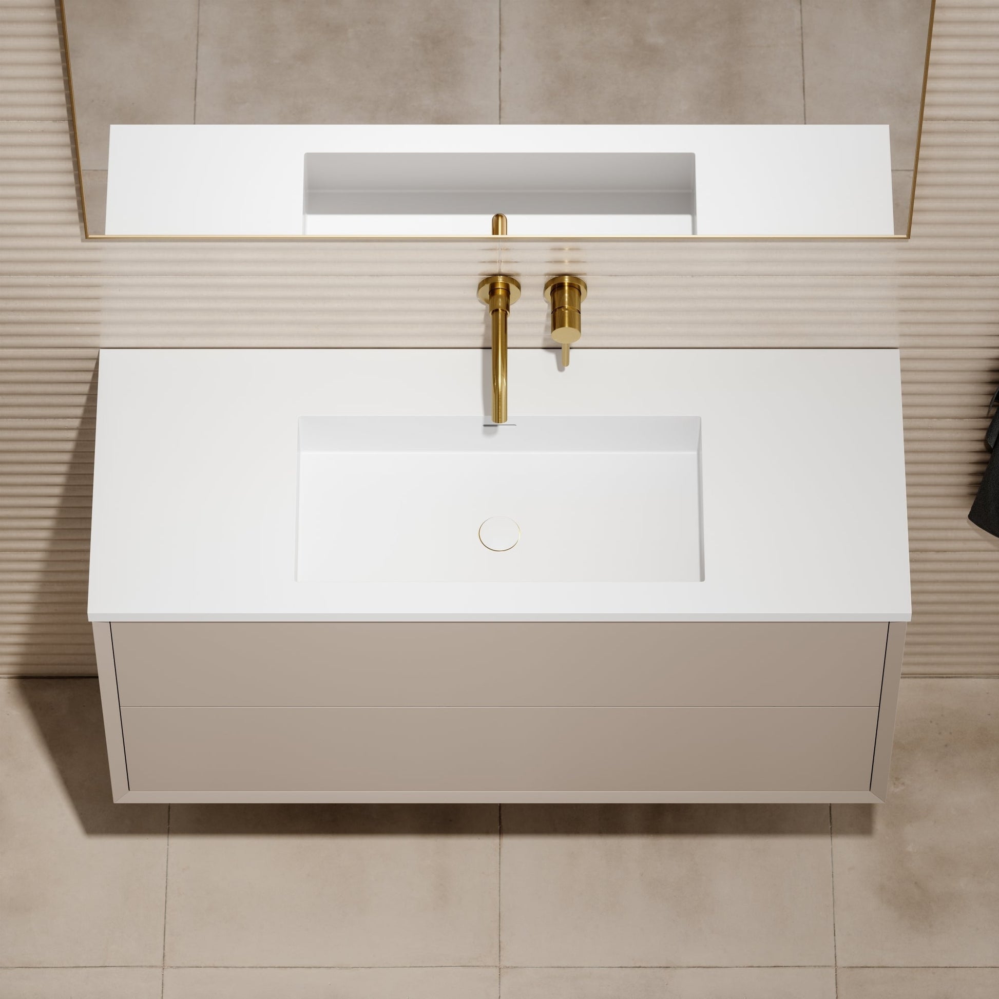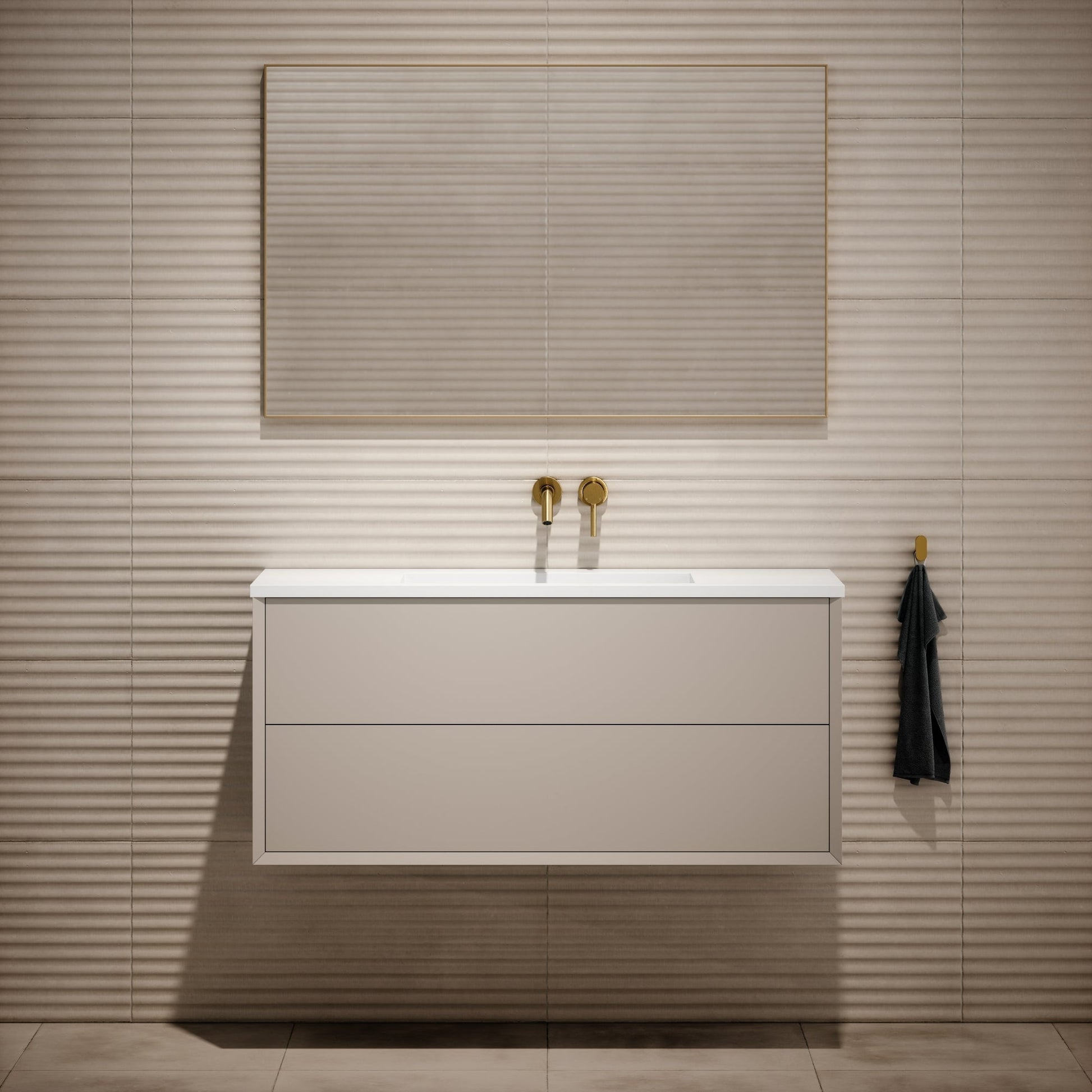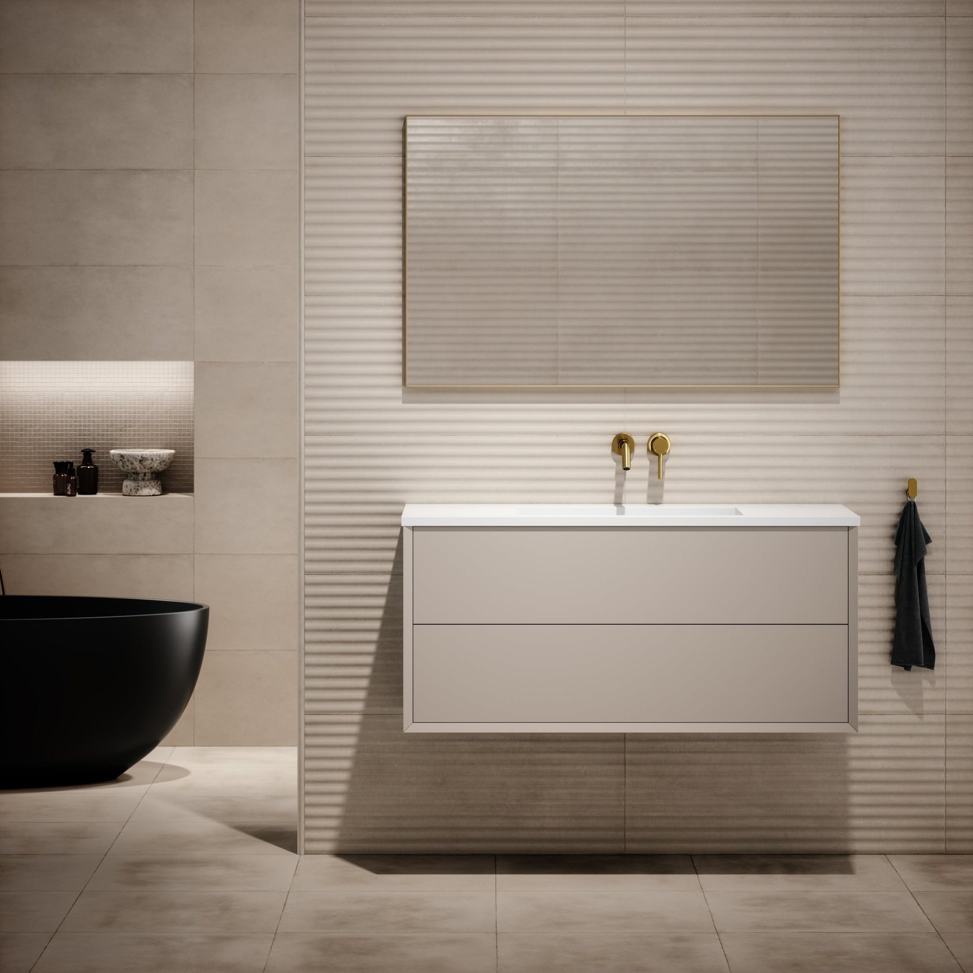 The Matte Cappuccino 1200 mm Wall Hung Vanity Unit is manufactured to a very high standard, featuring a luxurious bevelled edge design, with drawers that are opened by a spring release drawer system. The basin is made from white matte composite stone.