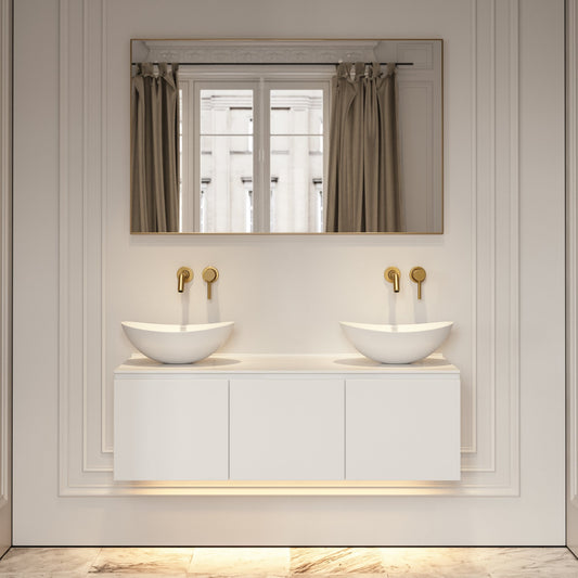 The 1200 mm vanity unit is manufactured to a very high standard, featuring a luxurious bevelled edge design. The drawers are opened by a spring release drawer system and the basin is made from white matte composite stone.