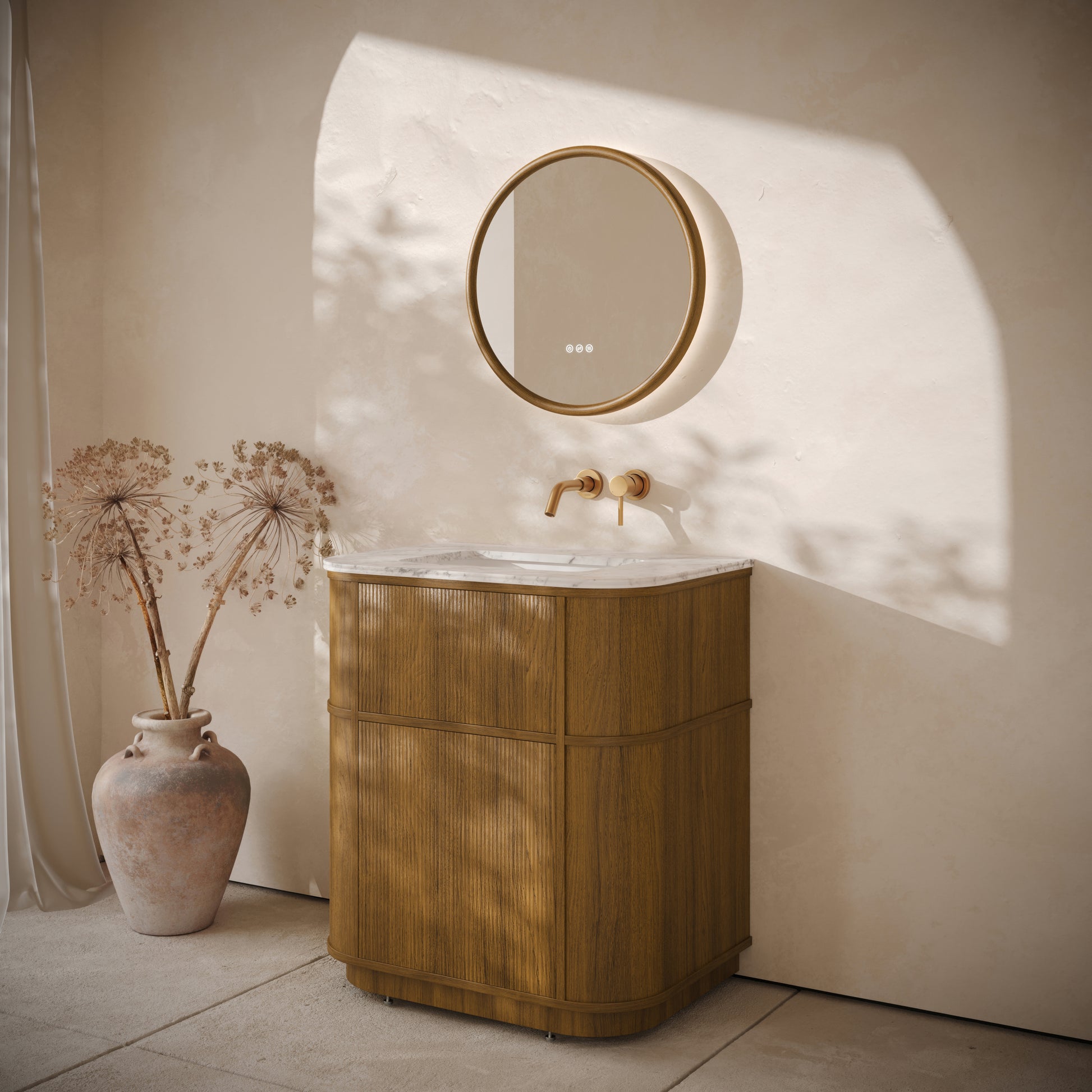 At 800mm wide, the practical vanity unit slots perfectly within a range of bathrooms and ensuites, from modern and mid-century to traditional, due to its sweeping curves and intricate fluted woodwork. The vanity unit is available in the warm honey oak finish, which works beautifully with warm brassware shades such as brushed gold, and contrasts well with either the Carrara marble countertop, or our signature Cortese® stone composite.