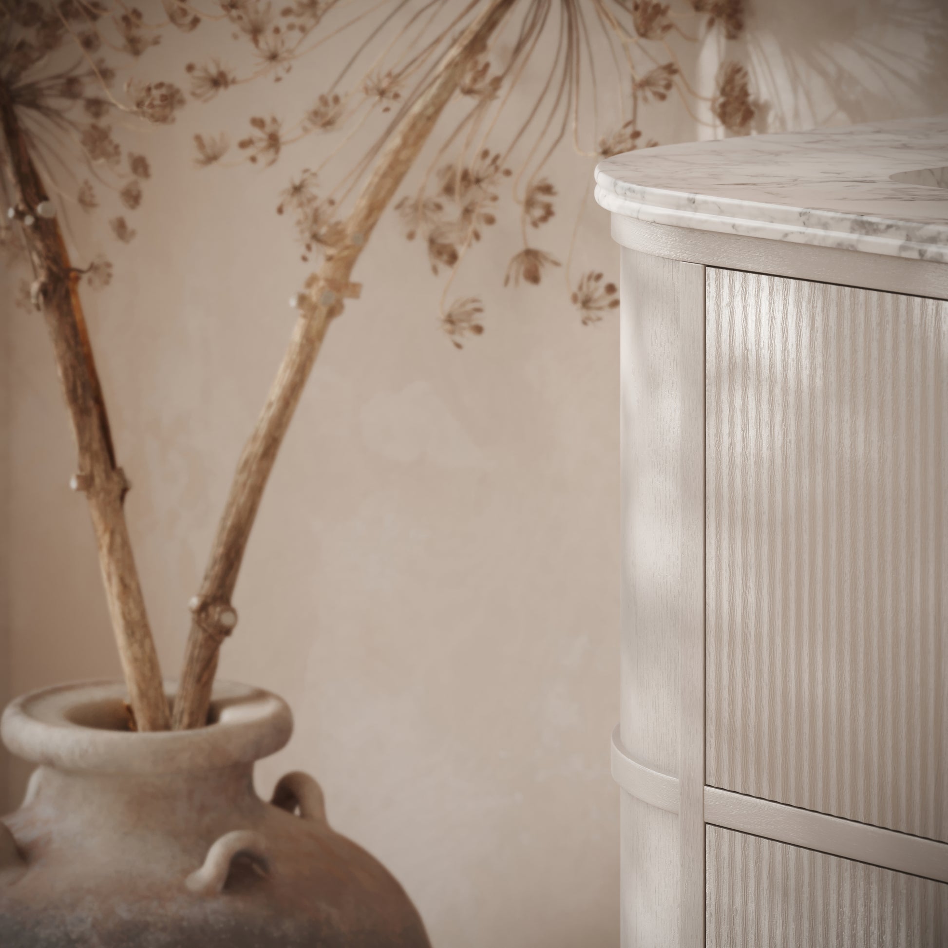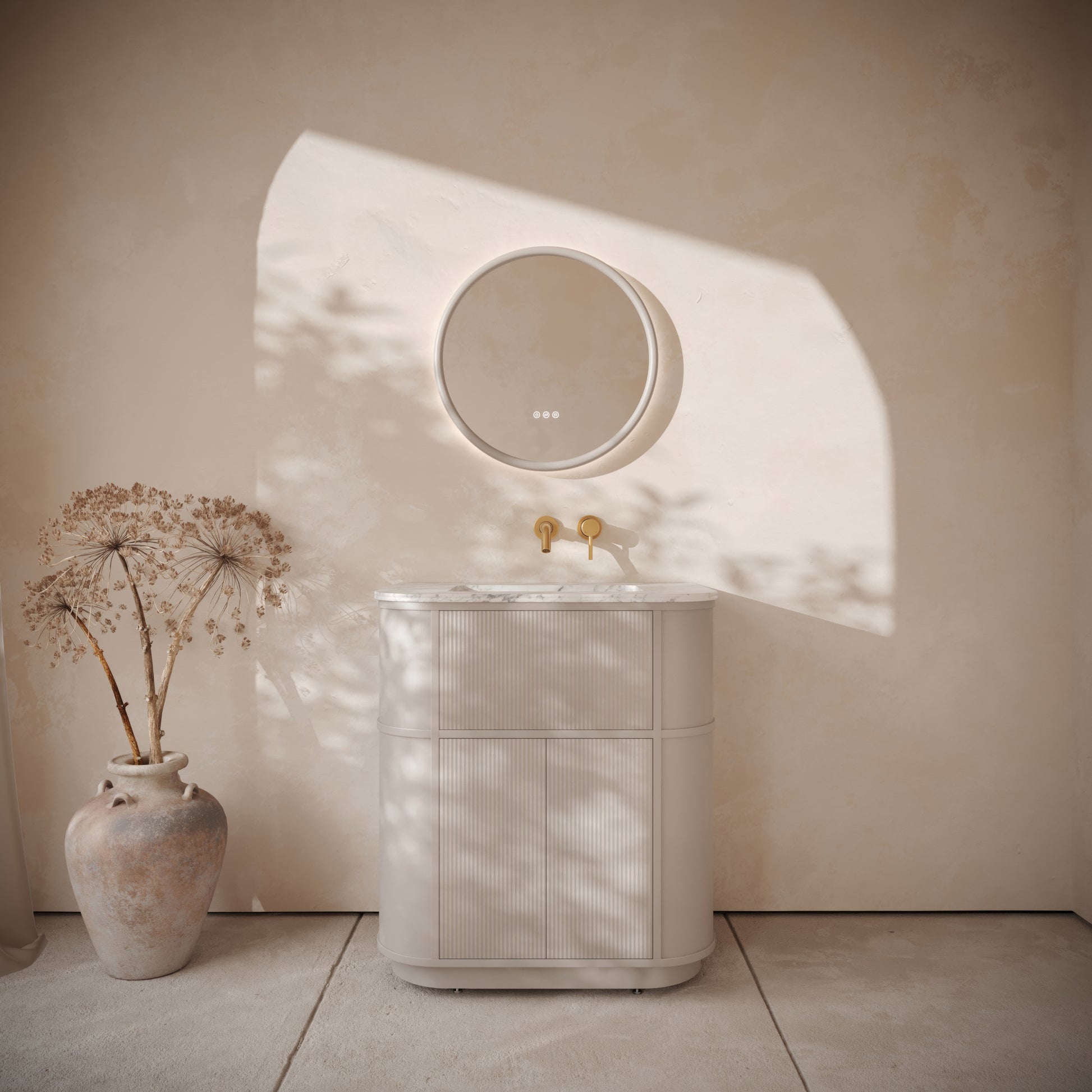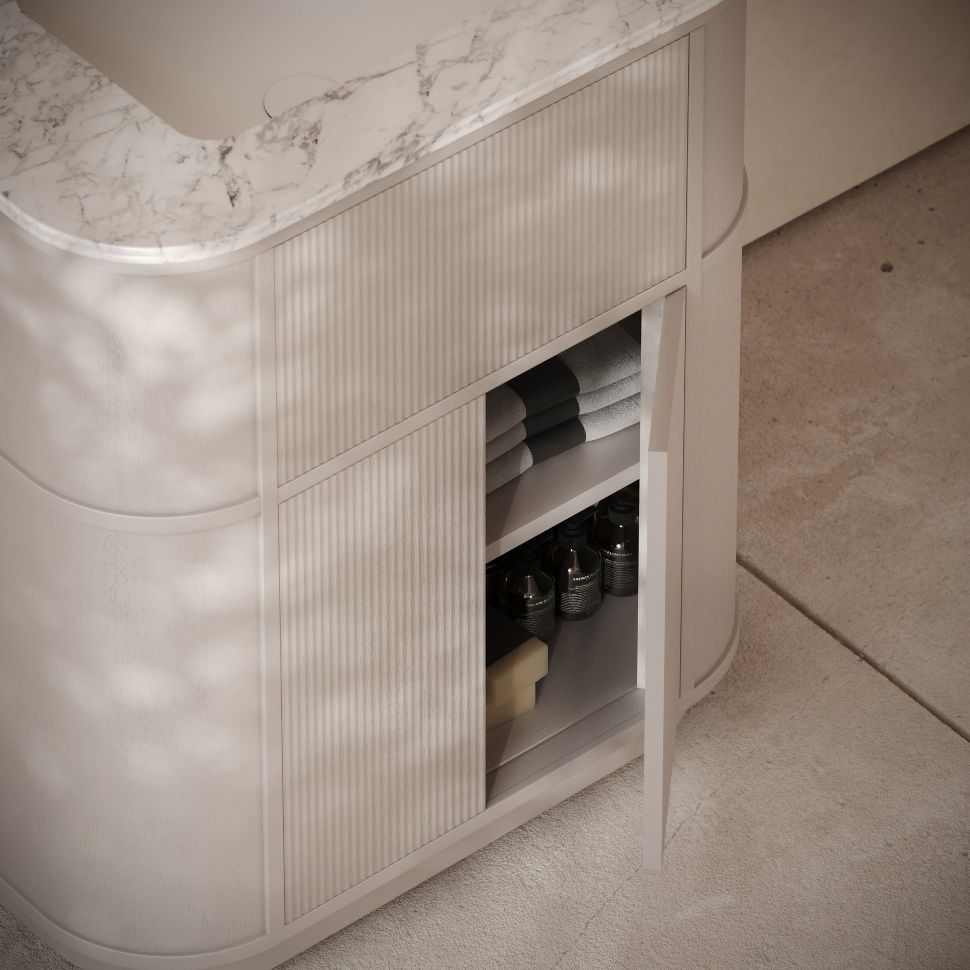 At 800mm wide, the vanity unit works beautifully in a range of bathrooms and ensuites, and features concealed storage for uncluttered living. The vanity unit takes design notes from mid-century interiors, with elegant fluted woodwork and sweeping curves, which is further elevated by our signature Cortese®, or our luxurious Carrara marble. The vanity unit operates with soft closing doors for seamless functionality.