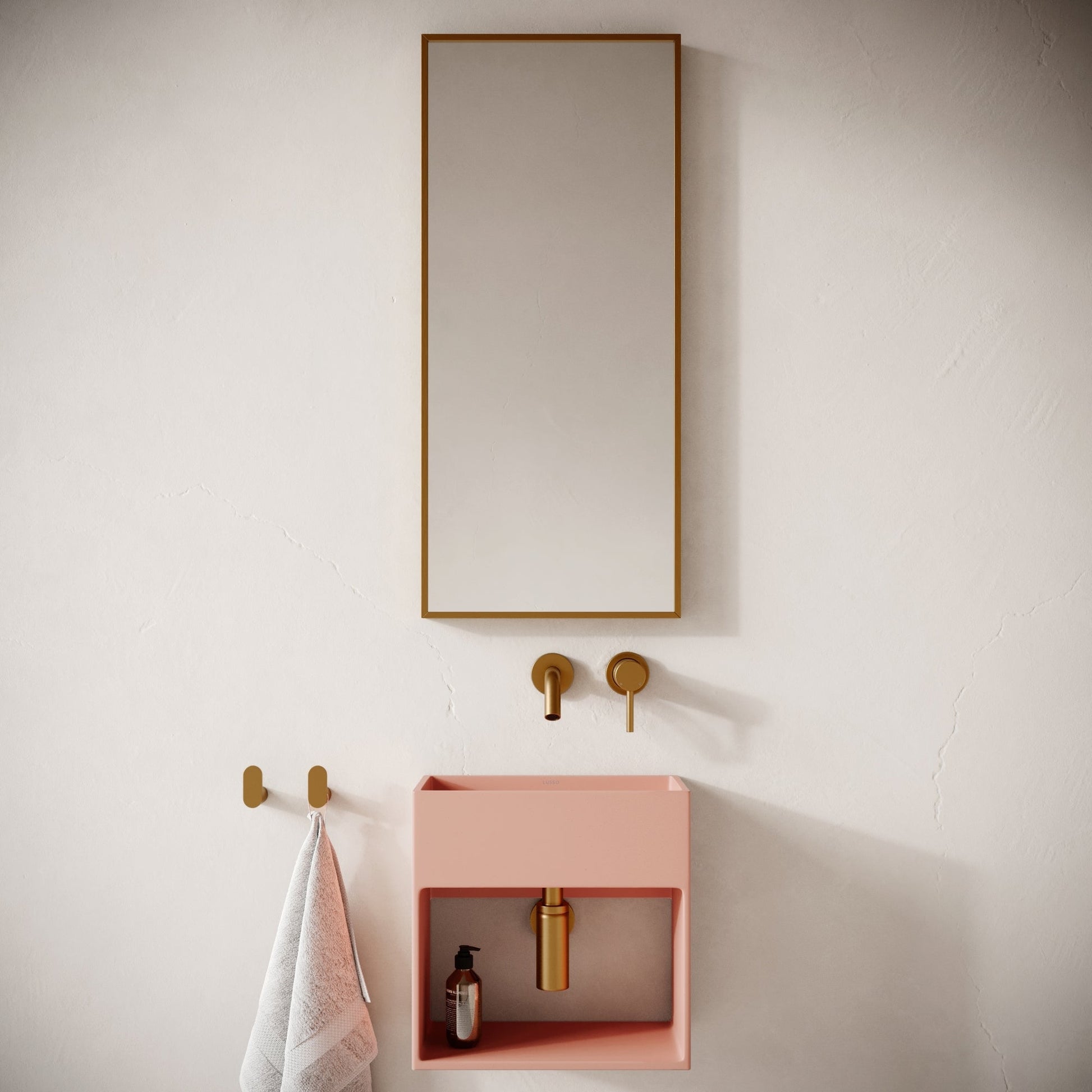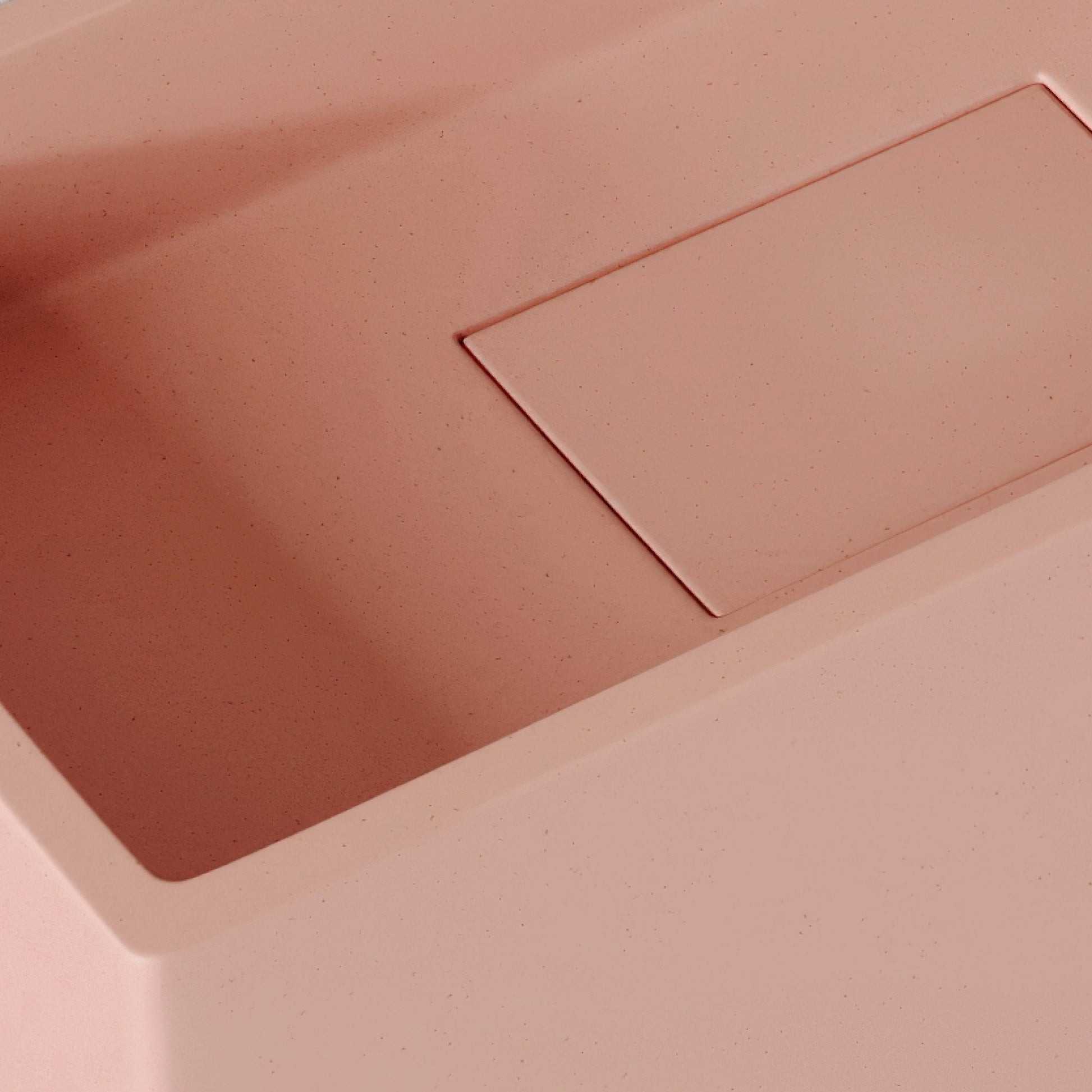 Enhance the ambience and aesthetic of your bathroom with the Esposa concrete basin, adding striking design and character to any space. The wall mounted basin features functioal details including a storage area for essentials and accessories. Presented in Blush, a soft powder pink, inspired by the annual bloom of the sakura, forever etched into Japan’s culture and tradition. Pair with matte white, black or brass taps to create your own signature style.