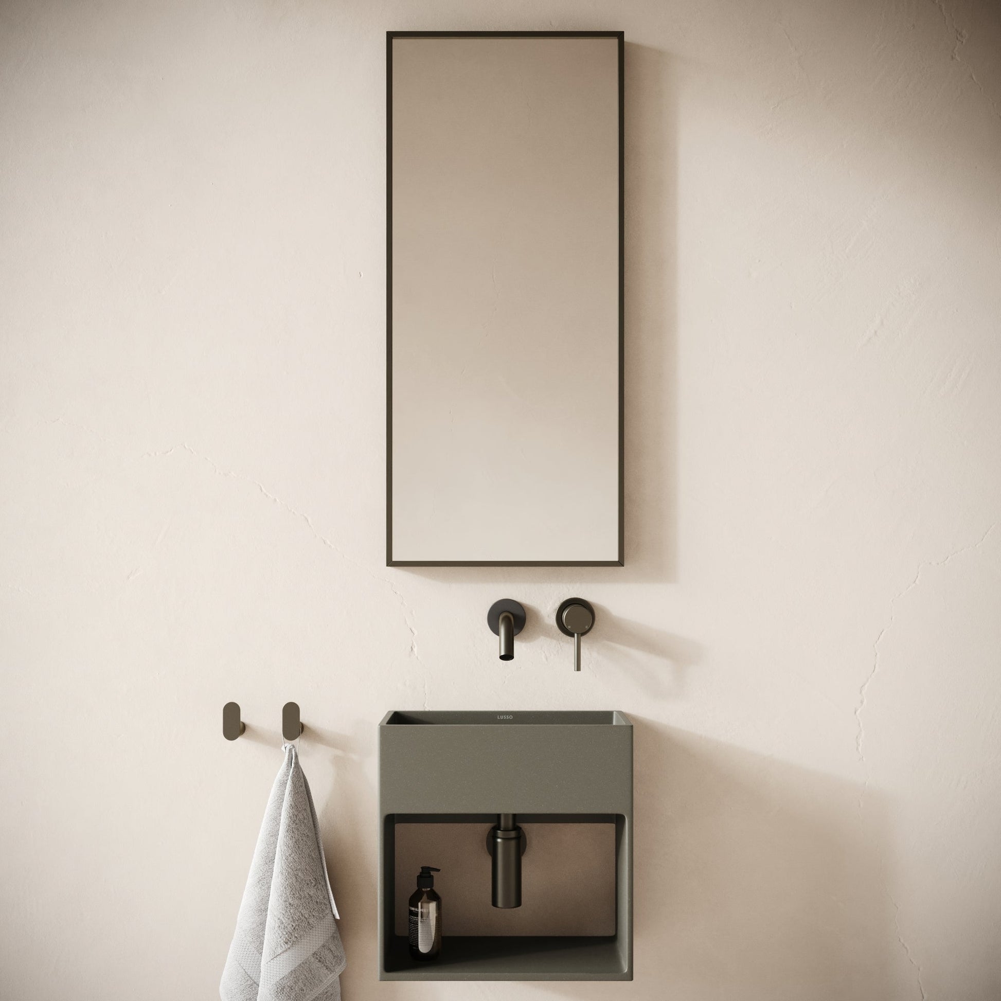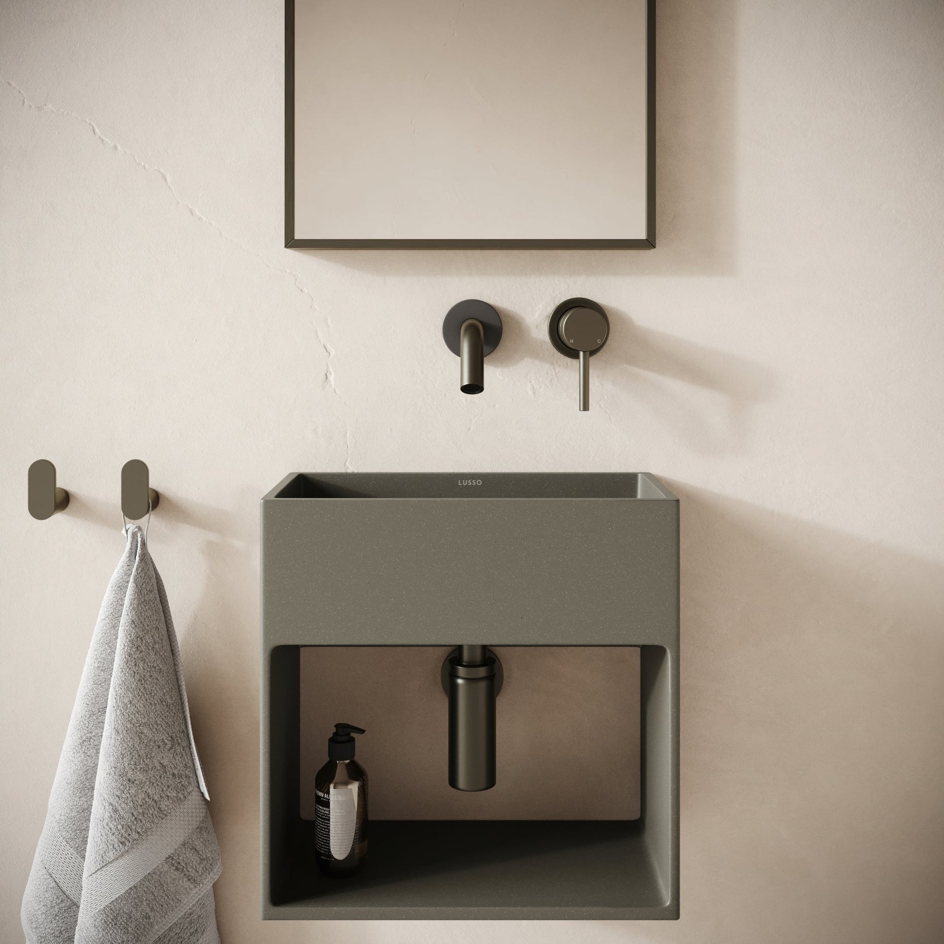 Enhance the ambience and aesthetic of your bathroom with the Esposa concrete basin, adding striking design and character to any space. The wall mounted basin features functioal details including a storage area for essentials and accessories. Presented in Oyster, a natural shade of grey, inspired by transient waves on the rocky coastlines of the Scottish Highlands.