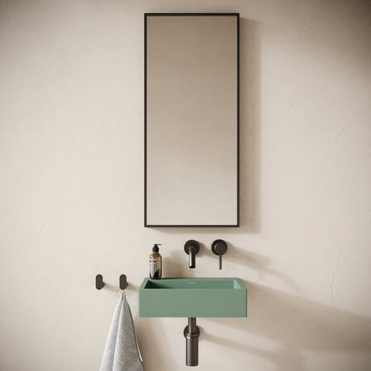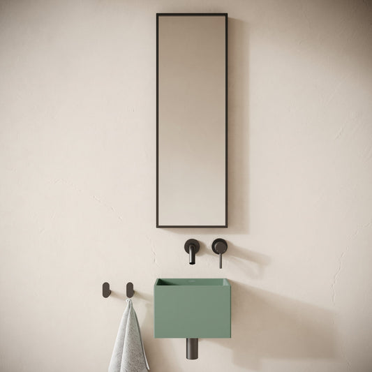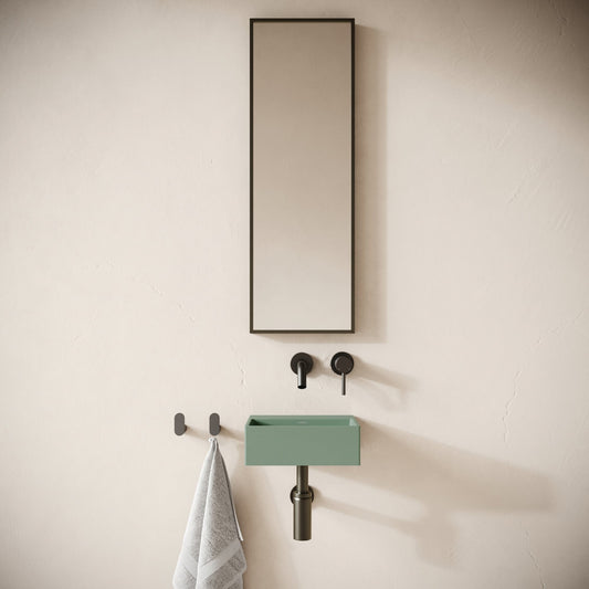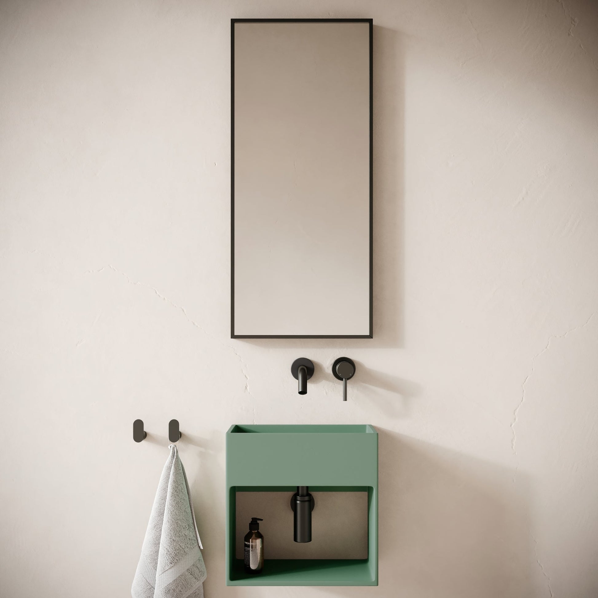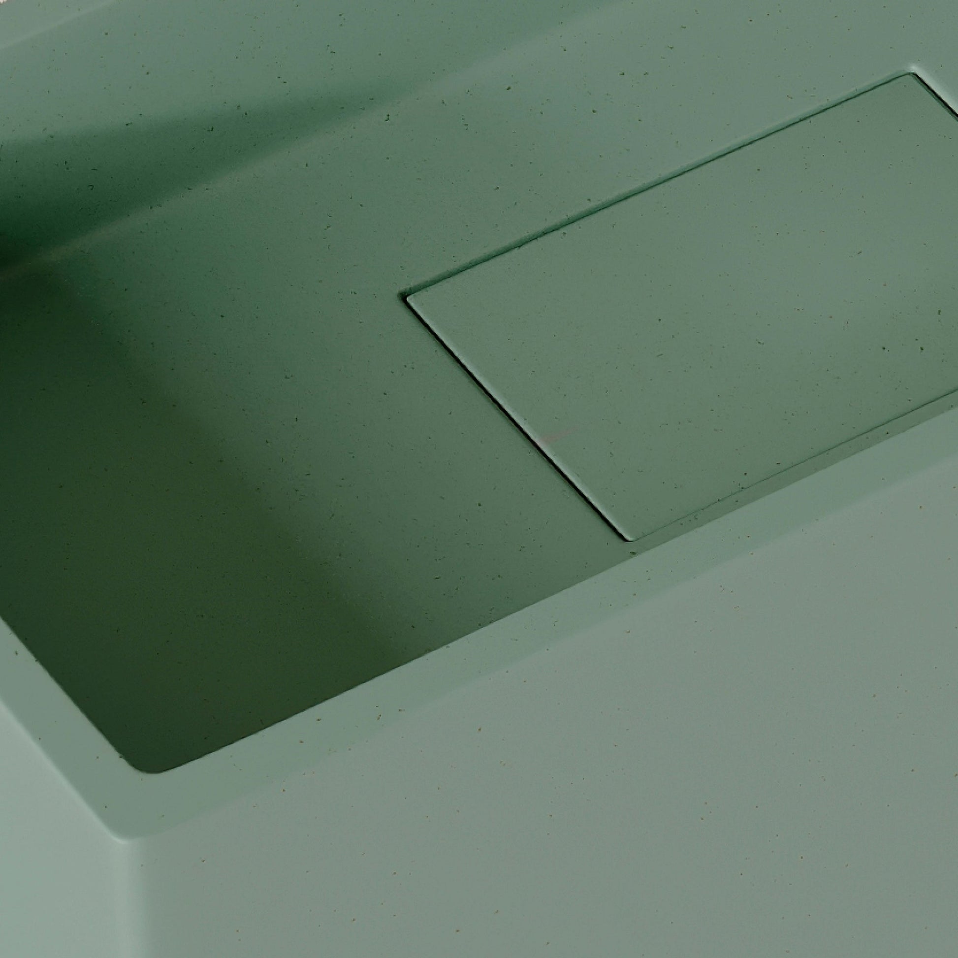 Enhance the ambience and aesthetic of your bathroom with the Esposa concrete basin, adding striking design and character to any space. The wall mounted basin features functioal details including a storage area for essentials and accessories. Displayed in Seafoam, a calming green, inspired by exotic getaways to the Indian ocean, where crystal clear waters shimmer in the evening sun. Combine with our range of basin taps and contrasting Cortese® stone products, to creative a distinctive bathroom aesthetic