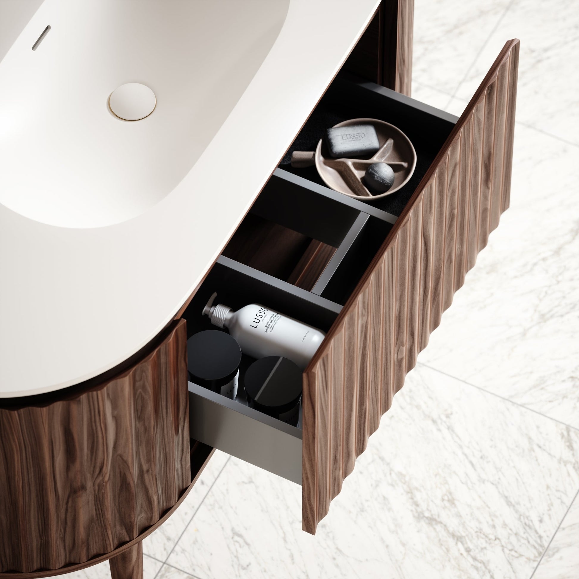The Regent Curved Natural Walnut Vanity Unit instantly adds sophistication and elegance to your bathroom.