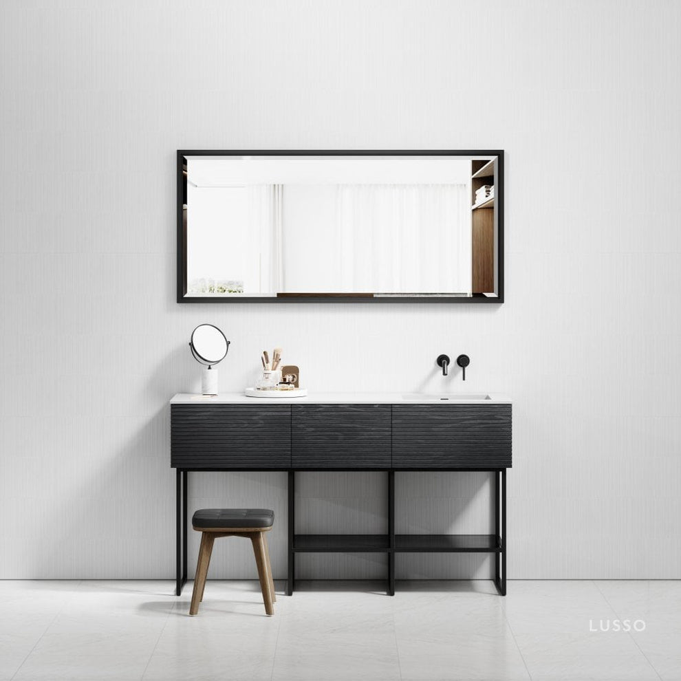 You’ll find a stone resin basin, high-grade steel, a genuine walnut veneer cabinet, a sturdy matte black frame and a complementary tempered black glass lower shelving. Thoughtfully and expertly designed, the Audemar Black Vanity Unit is built to last as well as look great in a range of bathroom spaces, perfectly styled with the matching Audemar mirror, which comes with the vanity unit.
