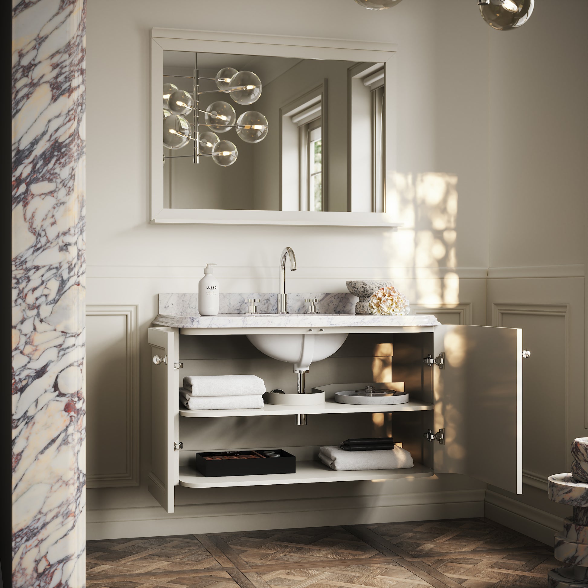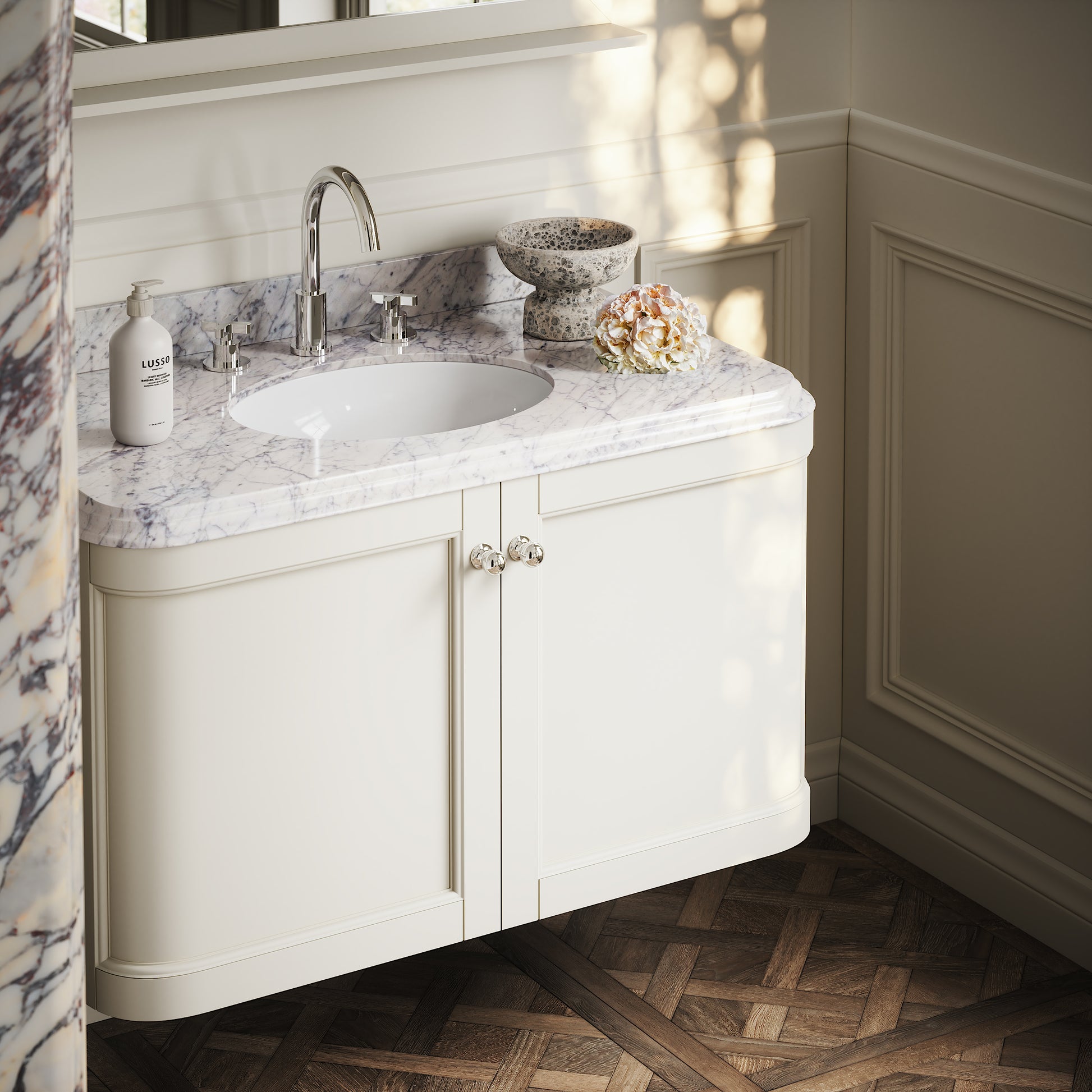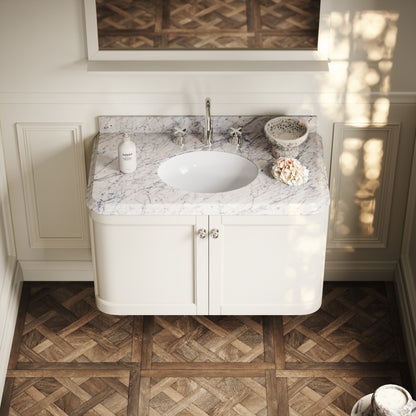The Charsley Vanity Unit is defined by its glamorous, elegant appearance. Featuring a smooth countertop carved from Italian Carrara marble in a polished finish, alongside a built-in oval basin, the wooden vanity unit is a seamless contrast between modern and traditional design, finished with cove ogee bevelled edges.
