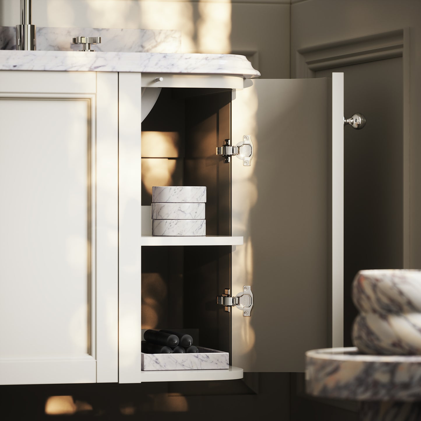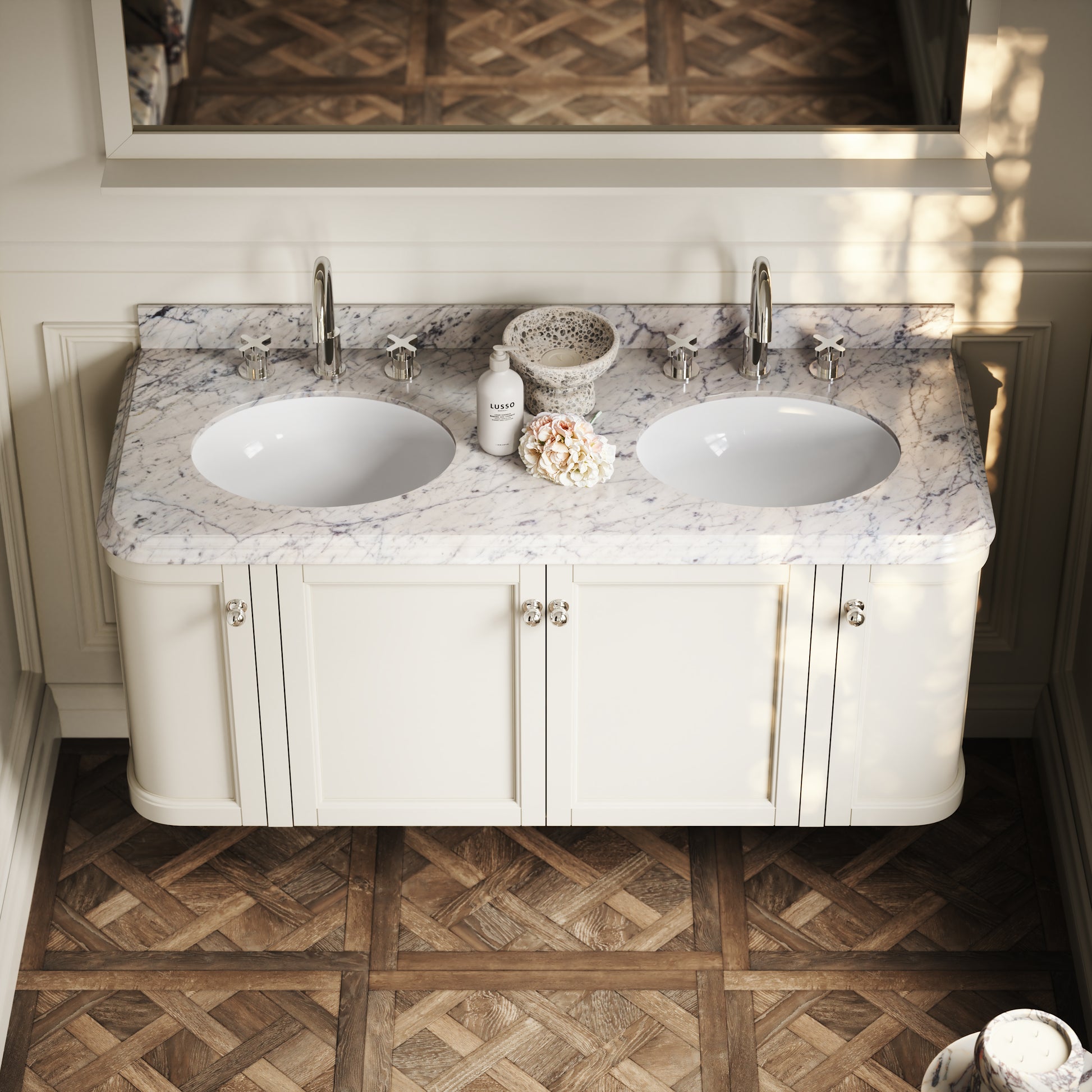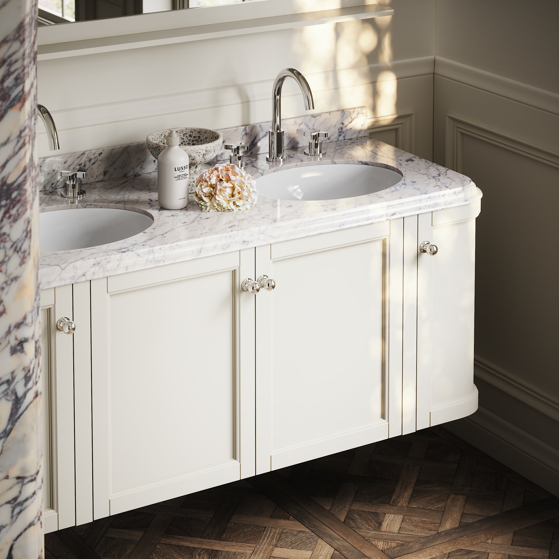 Elegant curves, bold lines and luxury polished Carrara marble makes the Charsley vanity unit the perfect bathroom addition, merging design cues from 1920s glamour with contemporary style.