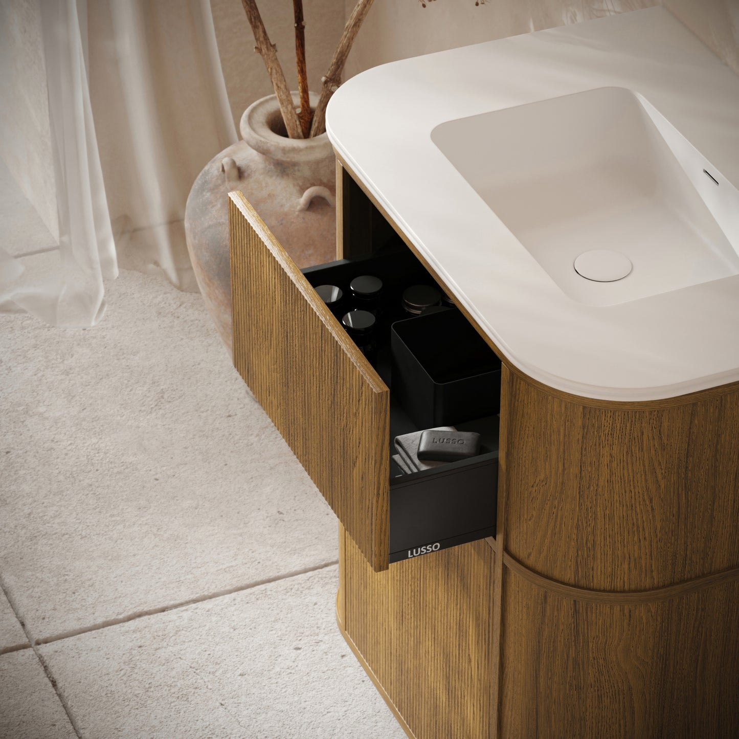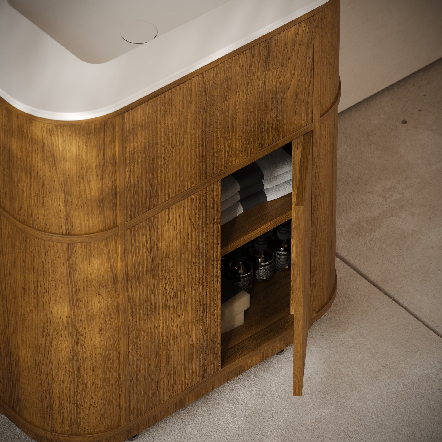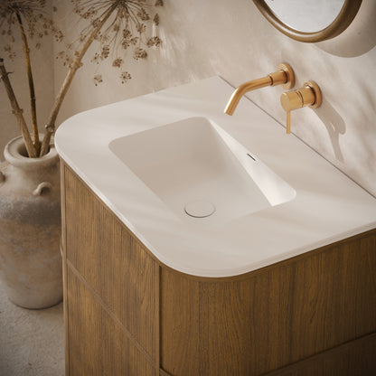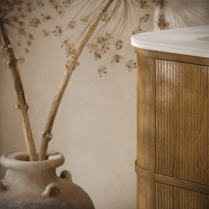 At 800mm wide, the practical vanity unit slots perfectly within a range of bathrooms and ensuites, from modern and mid-century to traditional, due to its sweeping curves and intricate fluted woodwork. The vanity unit is available in the warm honey oak finish, which works beautifully with warm brassware shades such as brushed gold, and contrasts well with either the Carrara marble countertop, or our signature Cortese® stone composite.