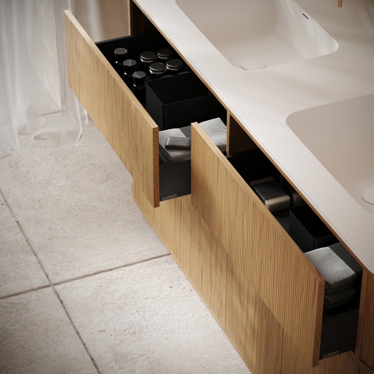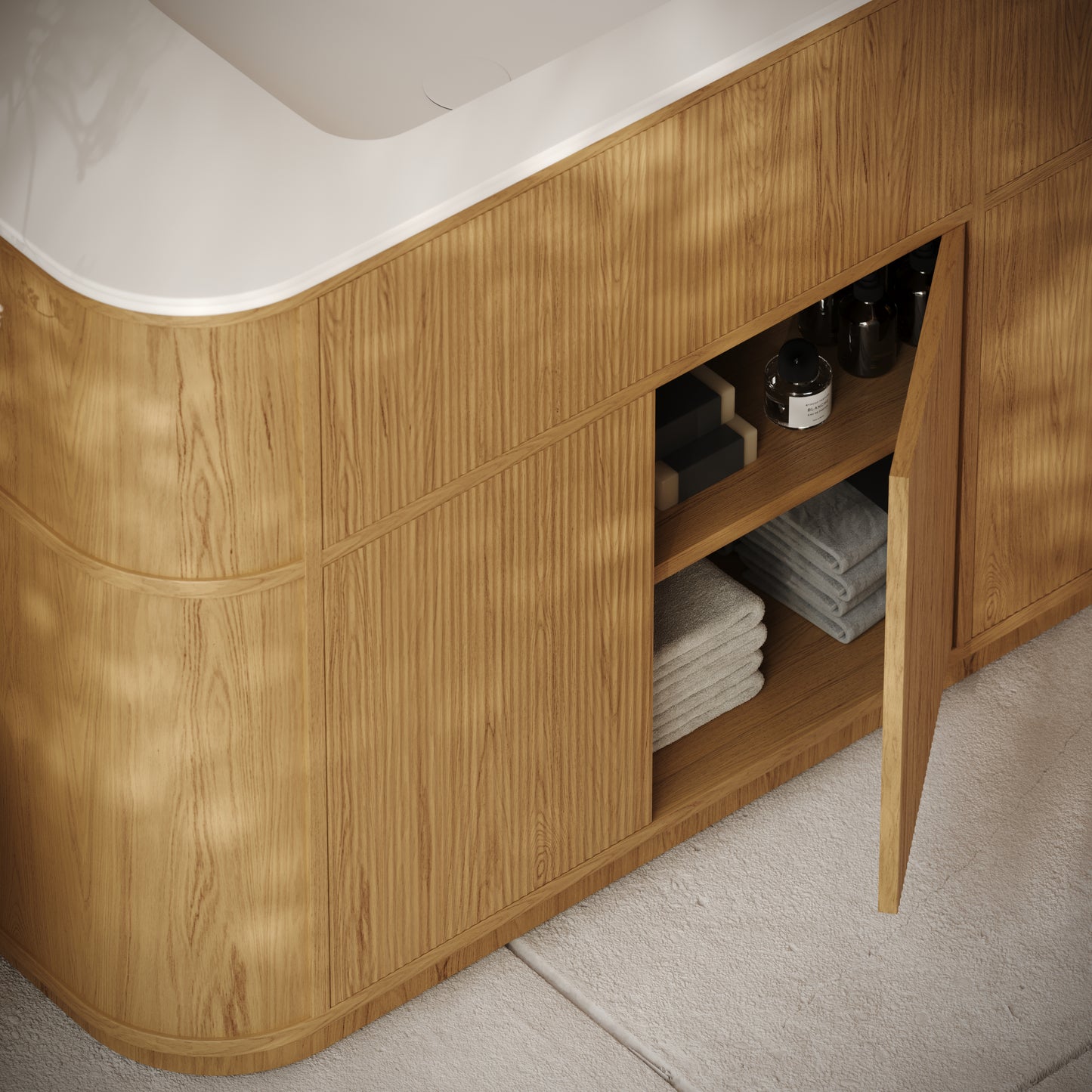 Perfect for couples or family bathrooms, the vanity unit is designed with practical double basins that are crafted from either our signature Cortese® stone composite or our Itallian Cararra marble, and features generous concealed storage to ensure uncluttered living. The vanity unit is available in an oak finish, which works beautifully with warm brassware shades such as brushed gold.