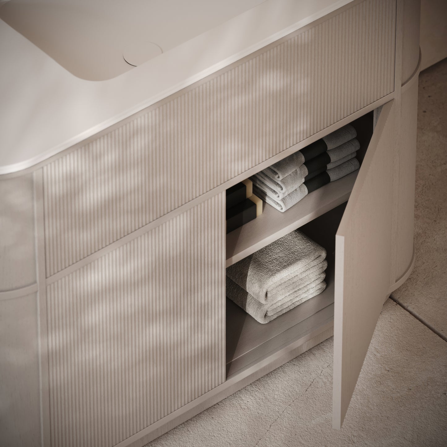 At 1200mm wide, the generously sized vanity unit provides concealed storage space for your bathroom essentials, and is finely detailed with elegant fluted woodwork topped with either Italian Carrara marble or soft white Cortese®. The beautiful vanity unit is perfect for a range of interior spaces, including mid-century, modern, and traditional, especially when paired with warm brassware tones such as gold and nickel.