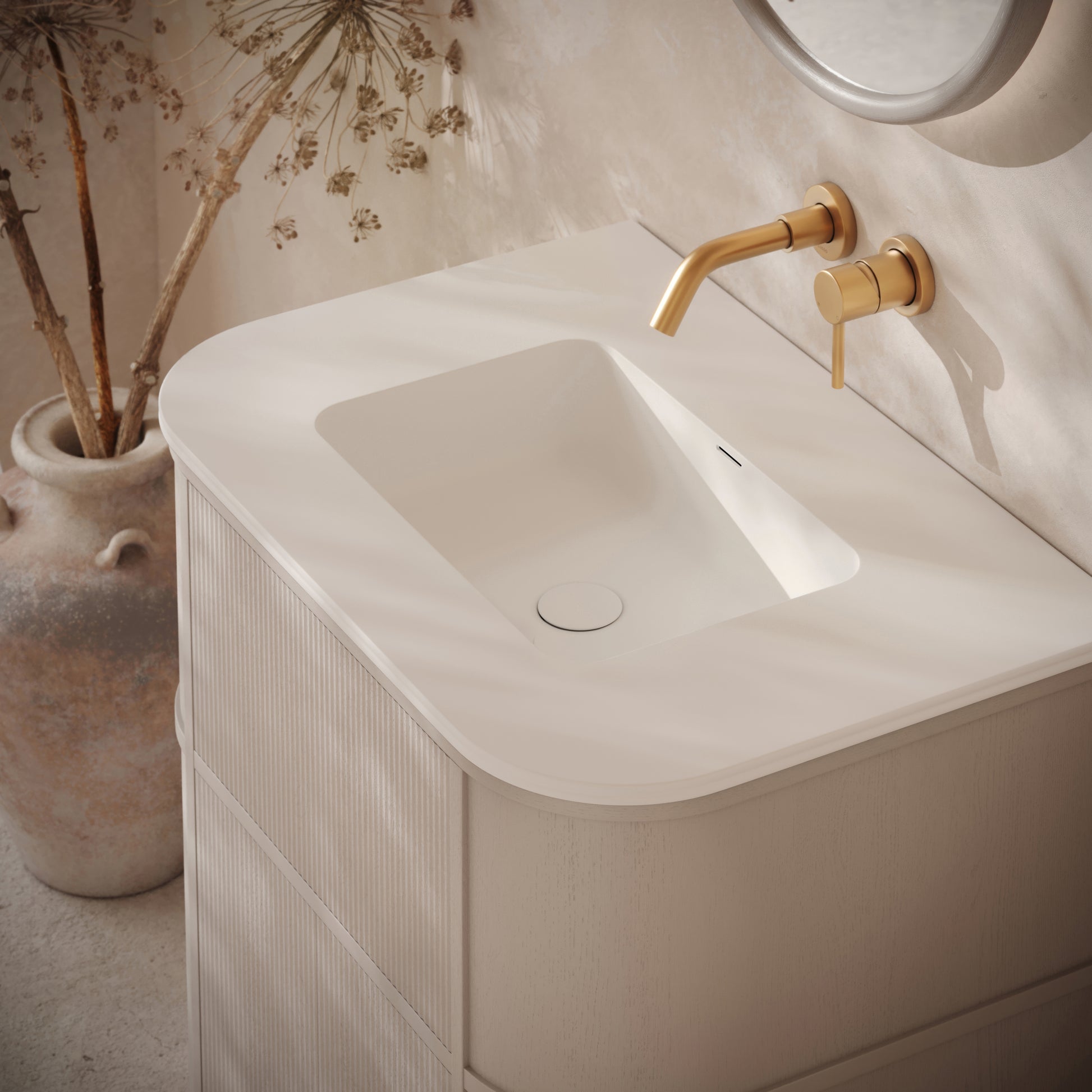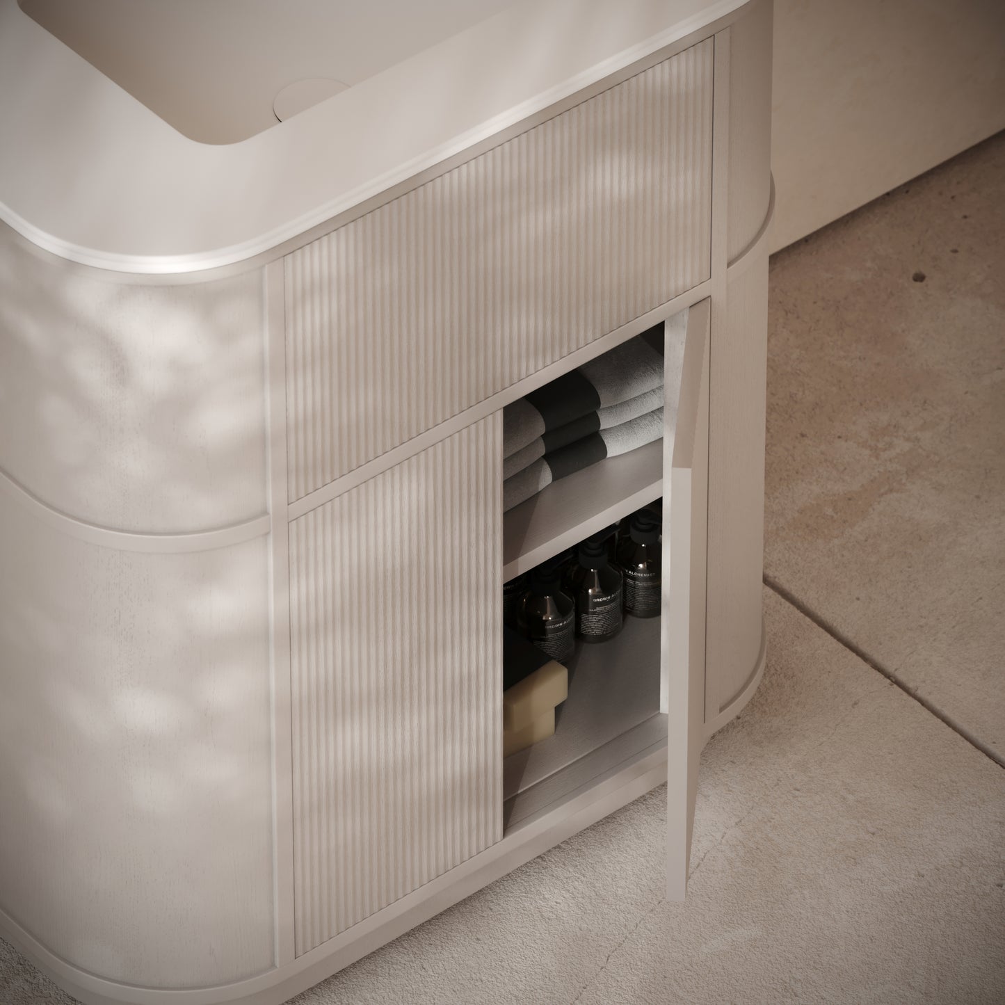At 800mm wide, the vanity unit works beautifully in a range of bathrooms and ensuites, and features concealed storage for uncluttered living. The vanity unit takes design notes from mid-century interiors, with elegant fluted woodwork and sweeping curves, which is further elevated by our signature Cortese®, or our luxurious Carrara marble. The vanity unit operates with soft closing doors for seamless functionality.