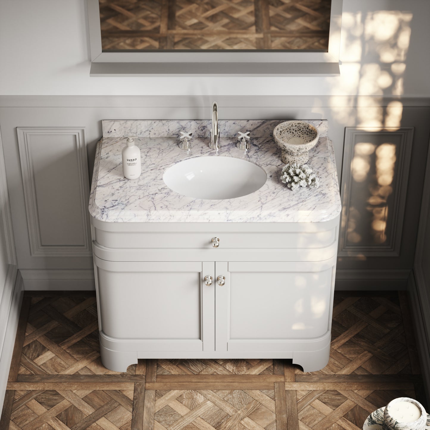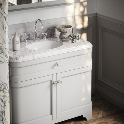 Crafted with impeccable attention to detail, the Connaught Matte White Vanity Unit features a countertop of Carrara marble in a polished finish, finely sourced from Italy, alongside a built-in oval basin and cove ogee bevelling, showcasing the luxury craftsmanship that’s synonymous with Lusso while in keeping with the Art Deco influence.