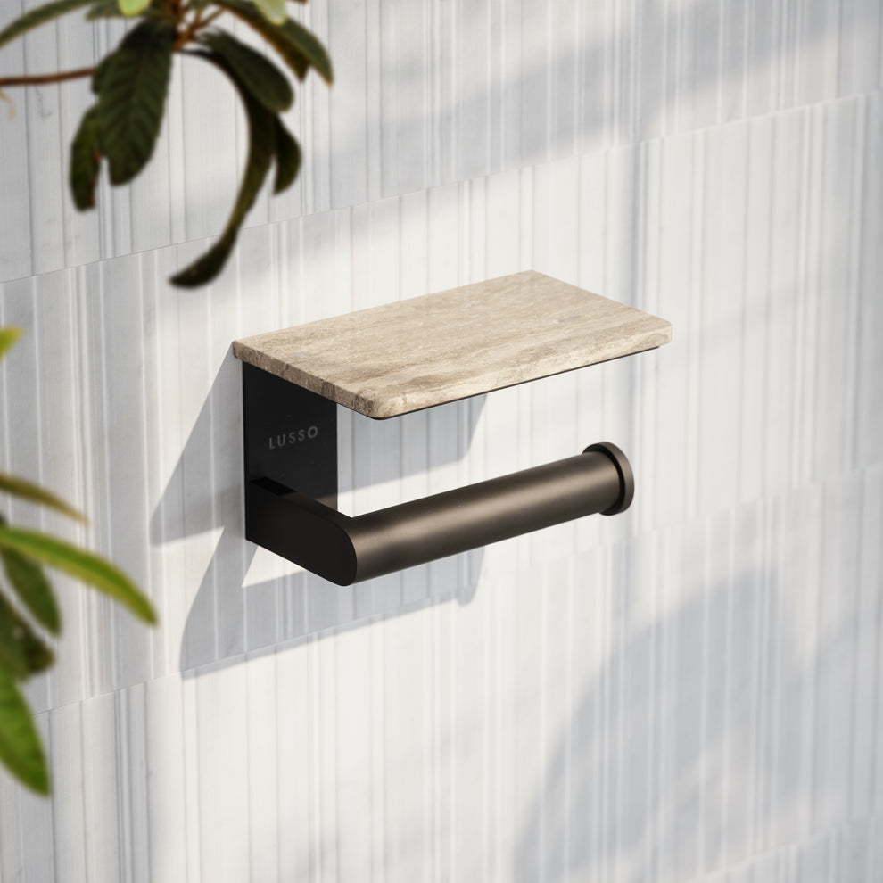 Deka Matte Black Toilet Roll Holder with Travertine Stone Shelf
