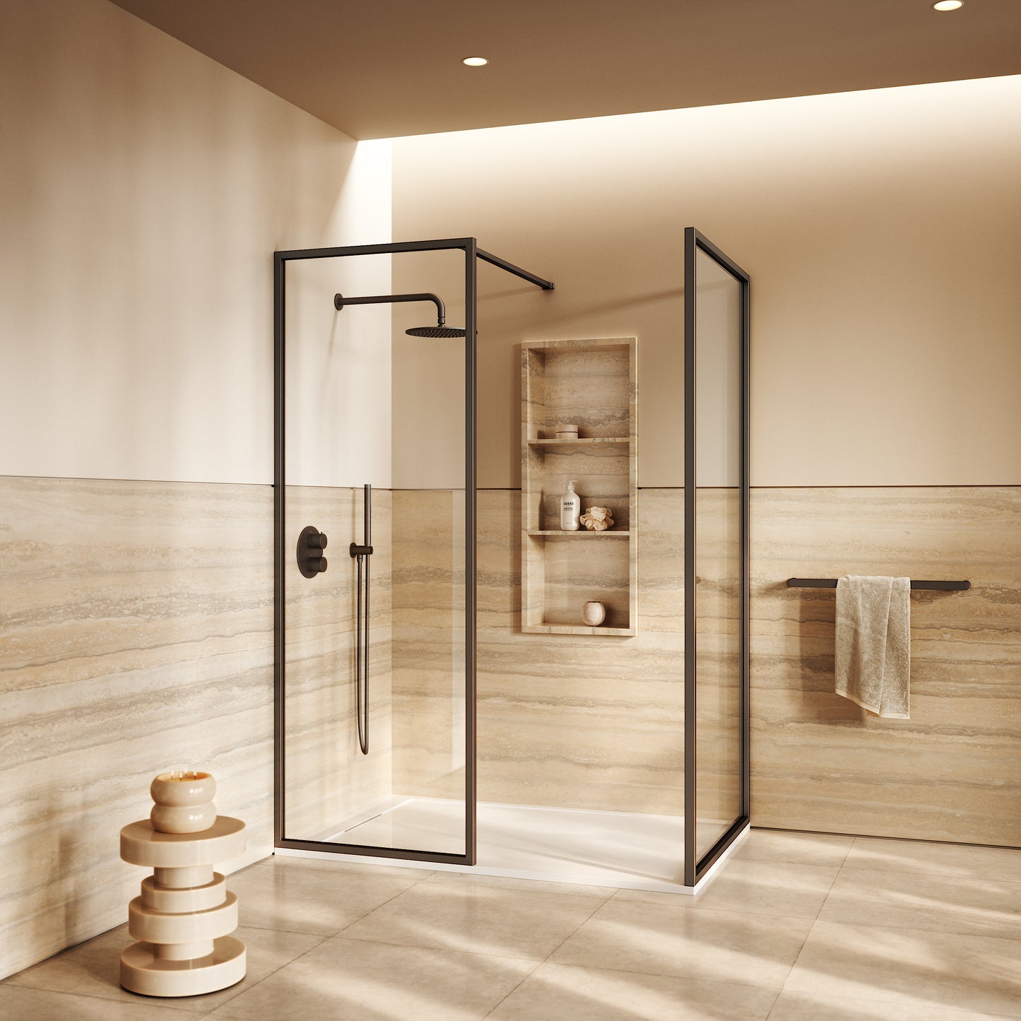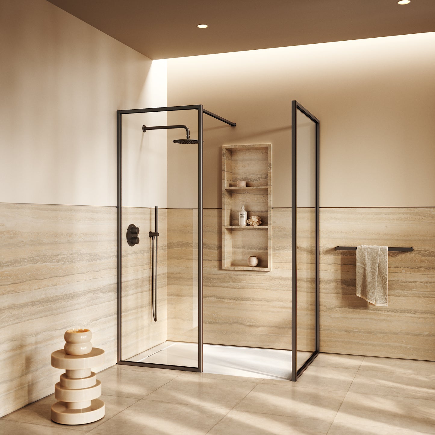 Transform your bathroom into a spa-like sanctuary with the Designo Walk-In Shower Enclosure. Inspired by the elegance of five-star resorts, this refined design combines comfort, style and meticulous craftsmanship. Defined by its antique-inspired deep bronze framework, the enclosure features two 8mm toughened glass panels treated with Clear Glaze technology, keeping the glass water-resistant and effortless to clean.