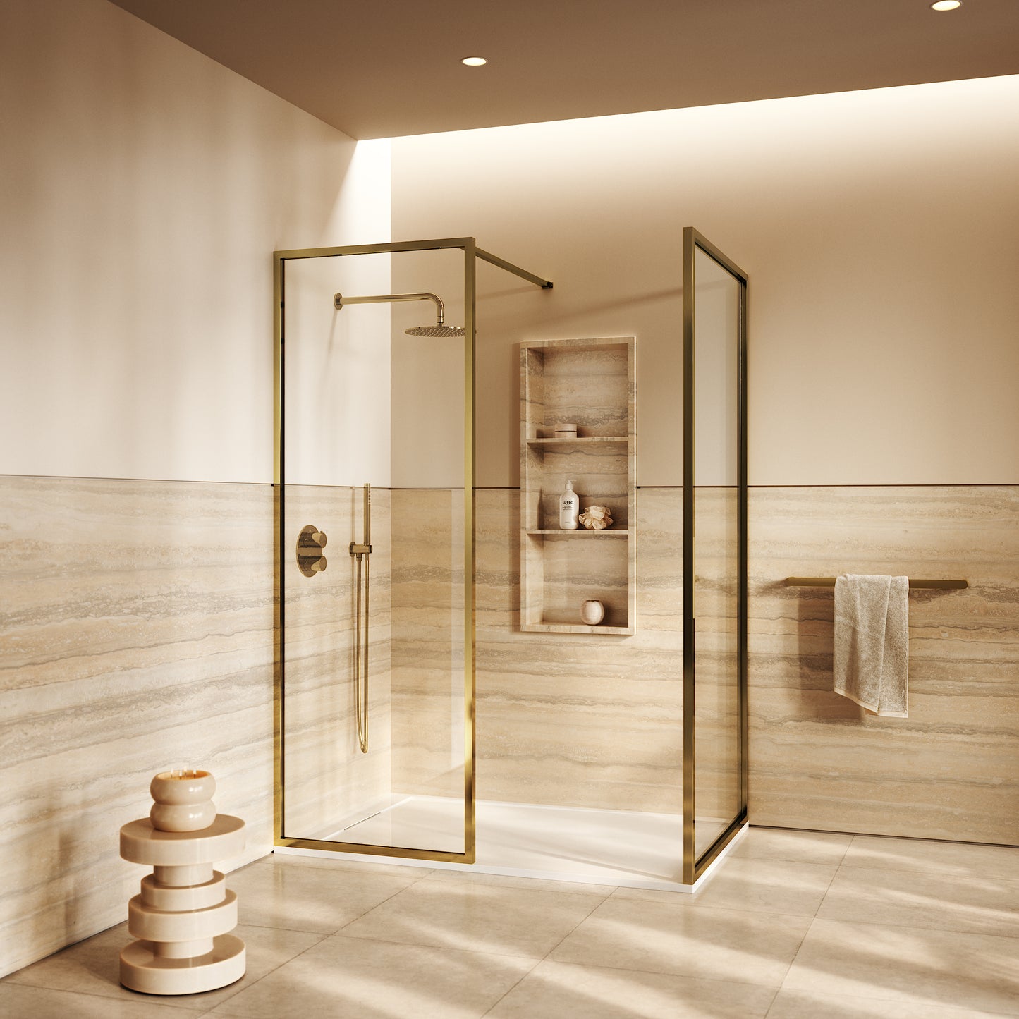 Transform your bathroom into a spa-like sanctuary with the Designo Walk-In Shower Enclosure. Inspired by the elegance of five-star resorts, this refined design combines comfort, style and meticulous craftsmanship. Defined by its antique-inspired polished brass framework, the enclosure features two 8mm toughened glass panels treated with Clear Glaze technology, keeping the glass water-resistant and effortless to clean.