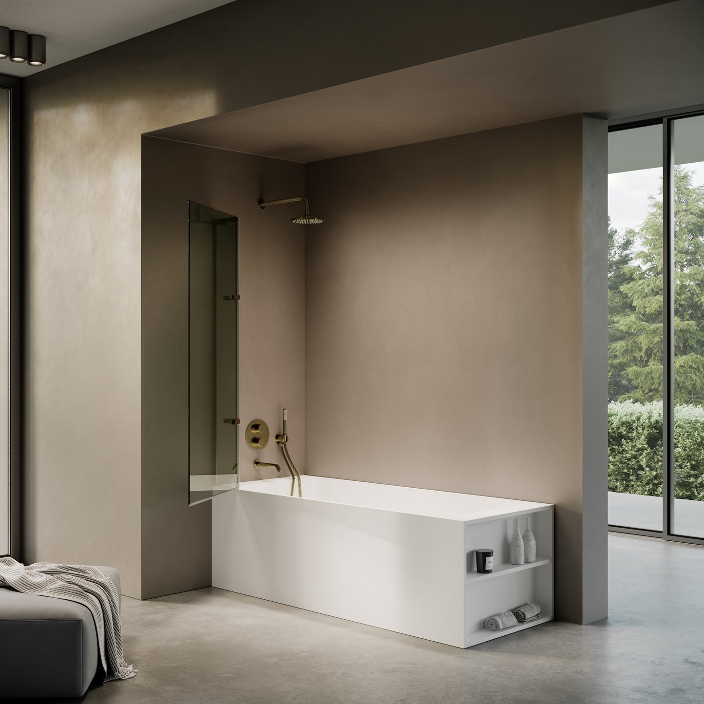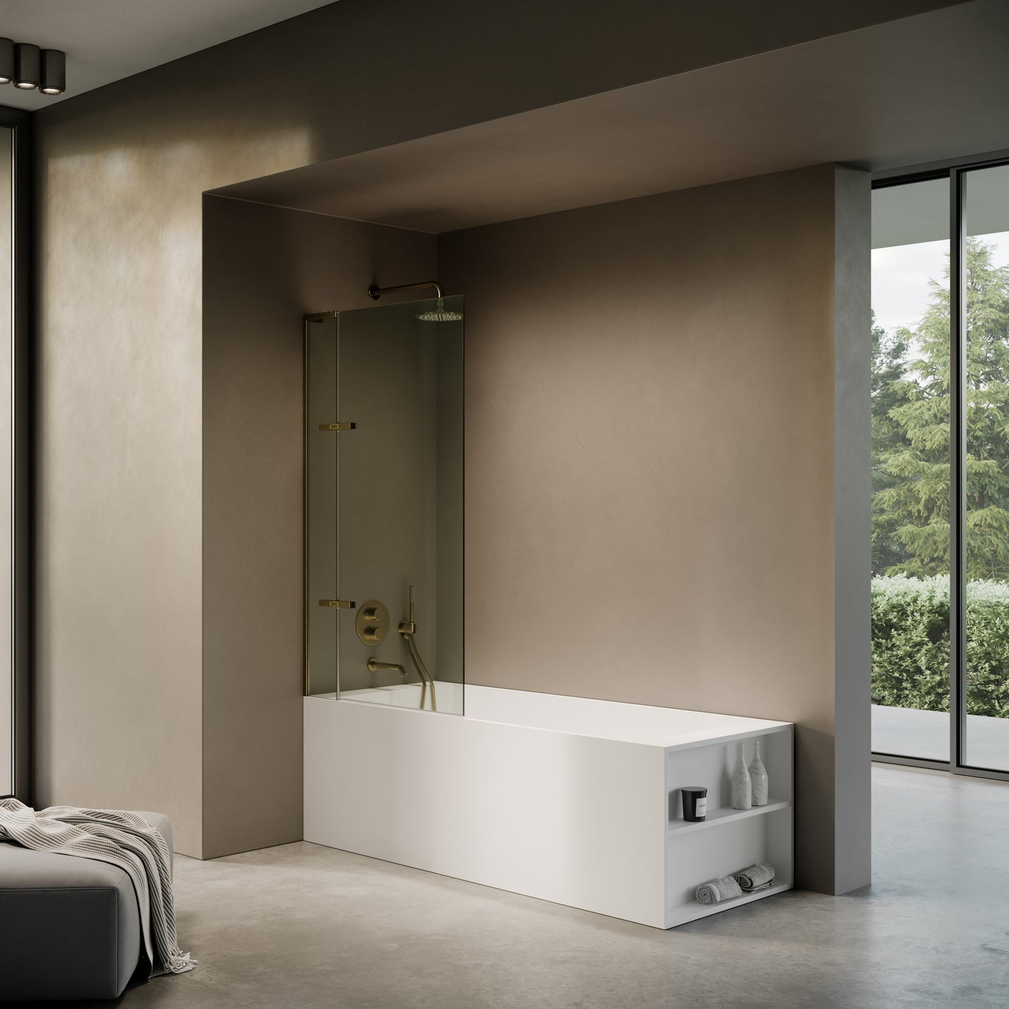 Finished with aged bronze accents, the Doccia screen exudes understated opulence, transforming your bath area into a serene sanctuary. For a cohesive aesthetic, pair with aged bronze brassware from the wider Lusso collection.