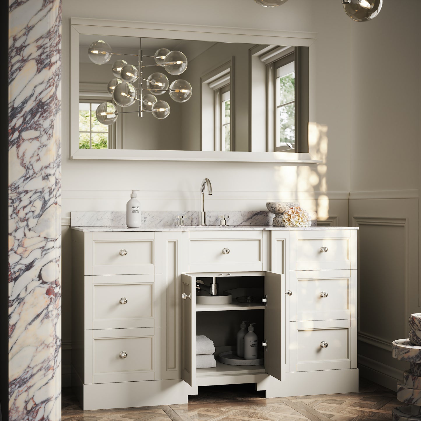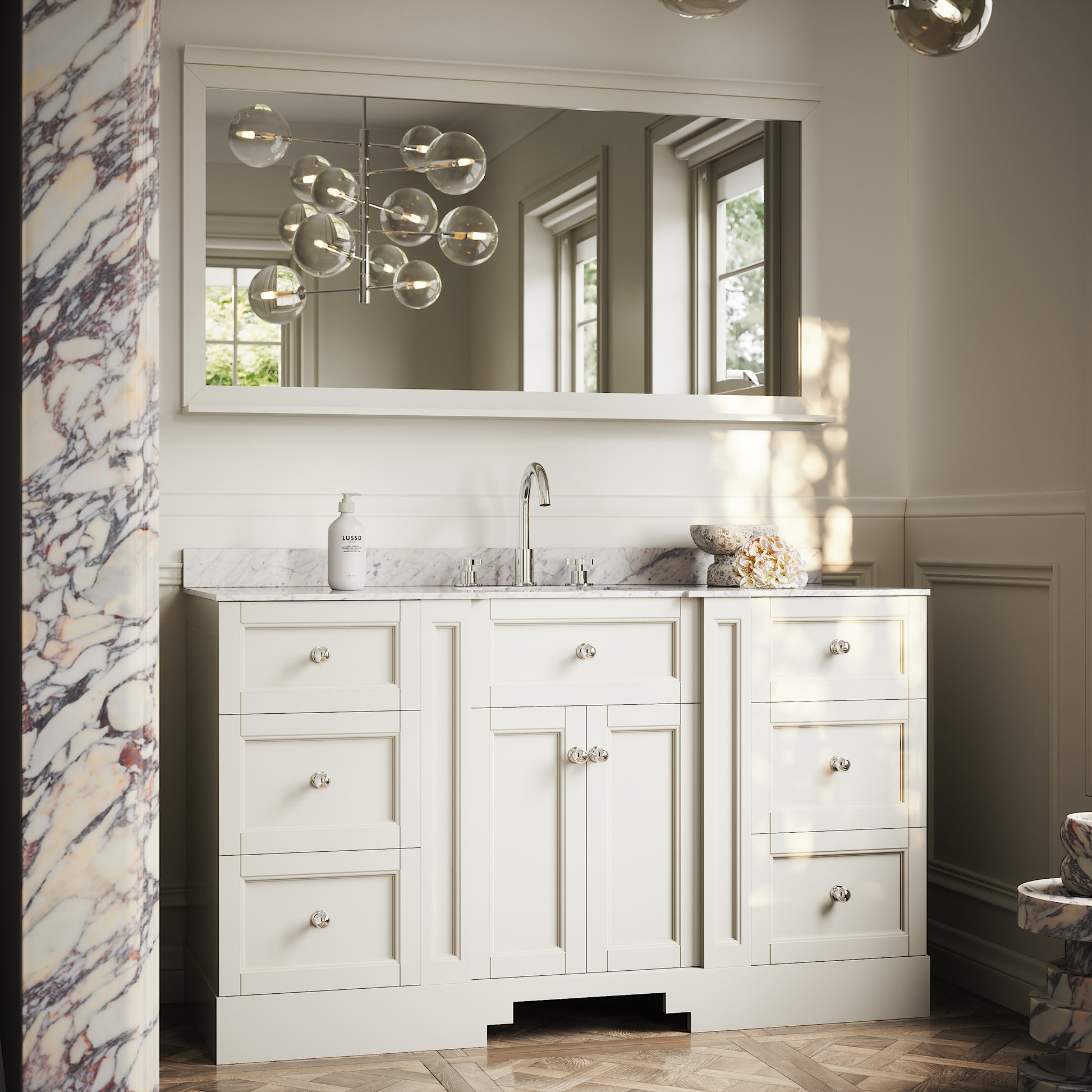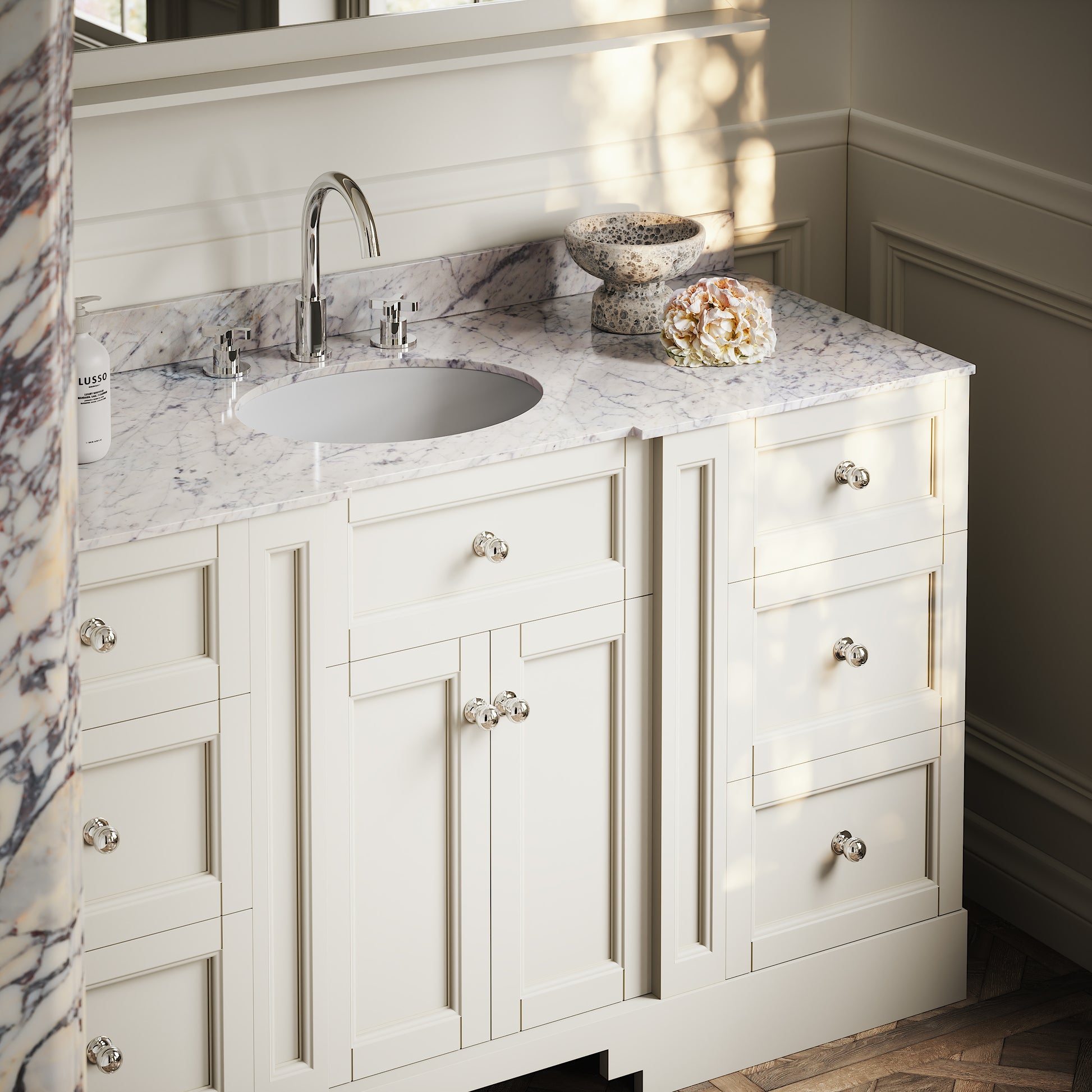 The Eaton Floorstanding Vanity Unit is a seamless blend between traditional and modern bathroom design, featuring a stunning countertop carved from polished Carrara marble with an oval-shaped built-in ceramic basin. This vanity unit is best suited to a family or couple’s bathroom due to its large countertop space and generous storage, designed to achieve clean and uncluttered living.