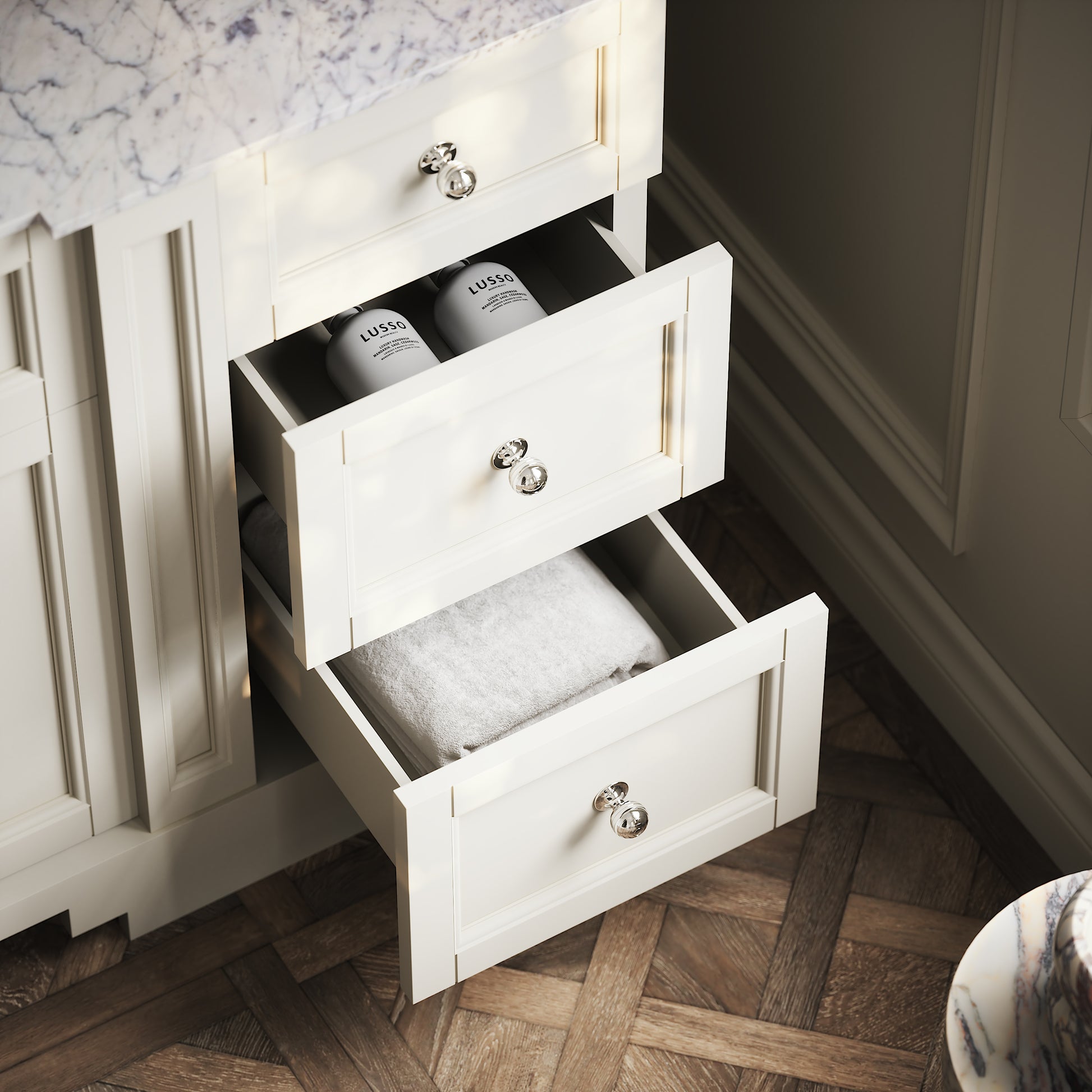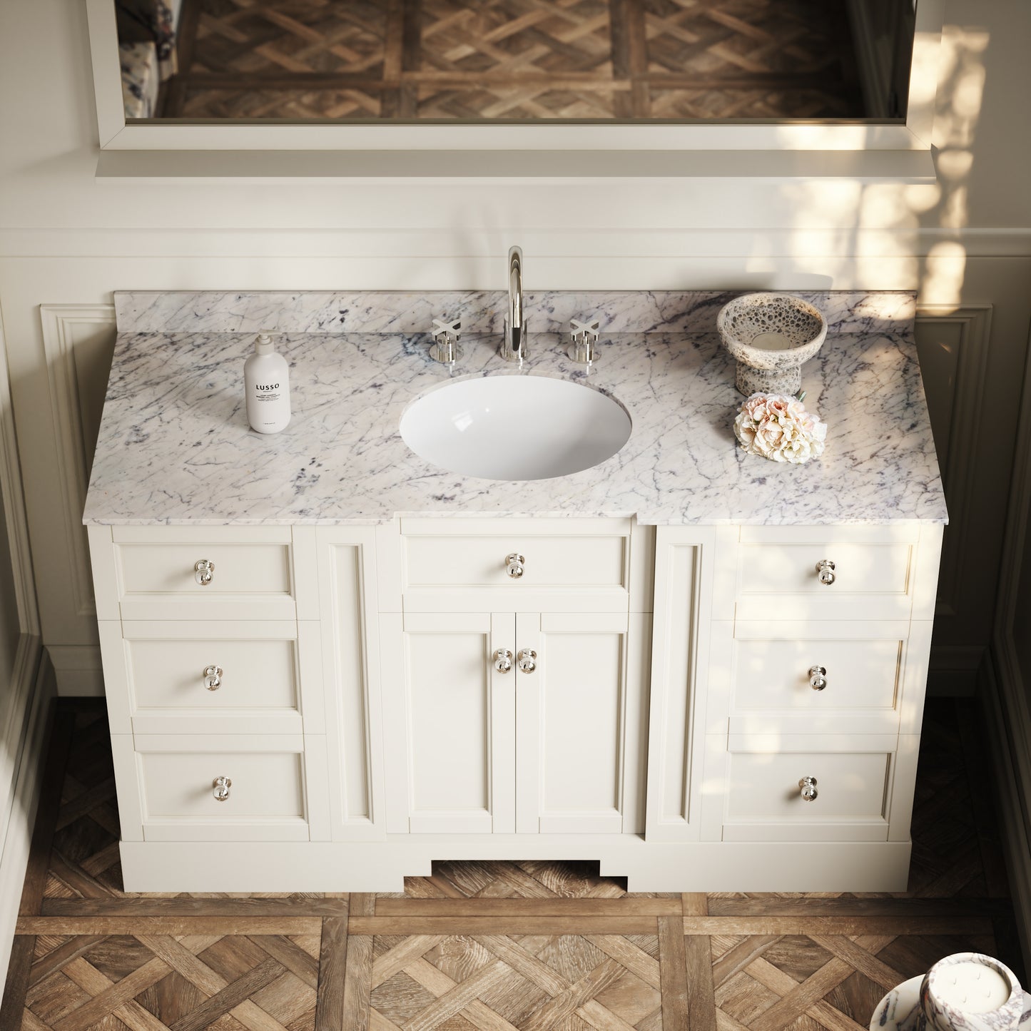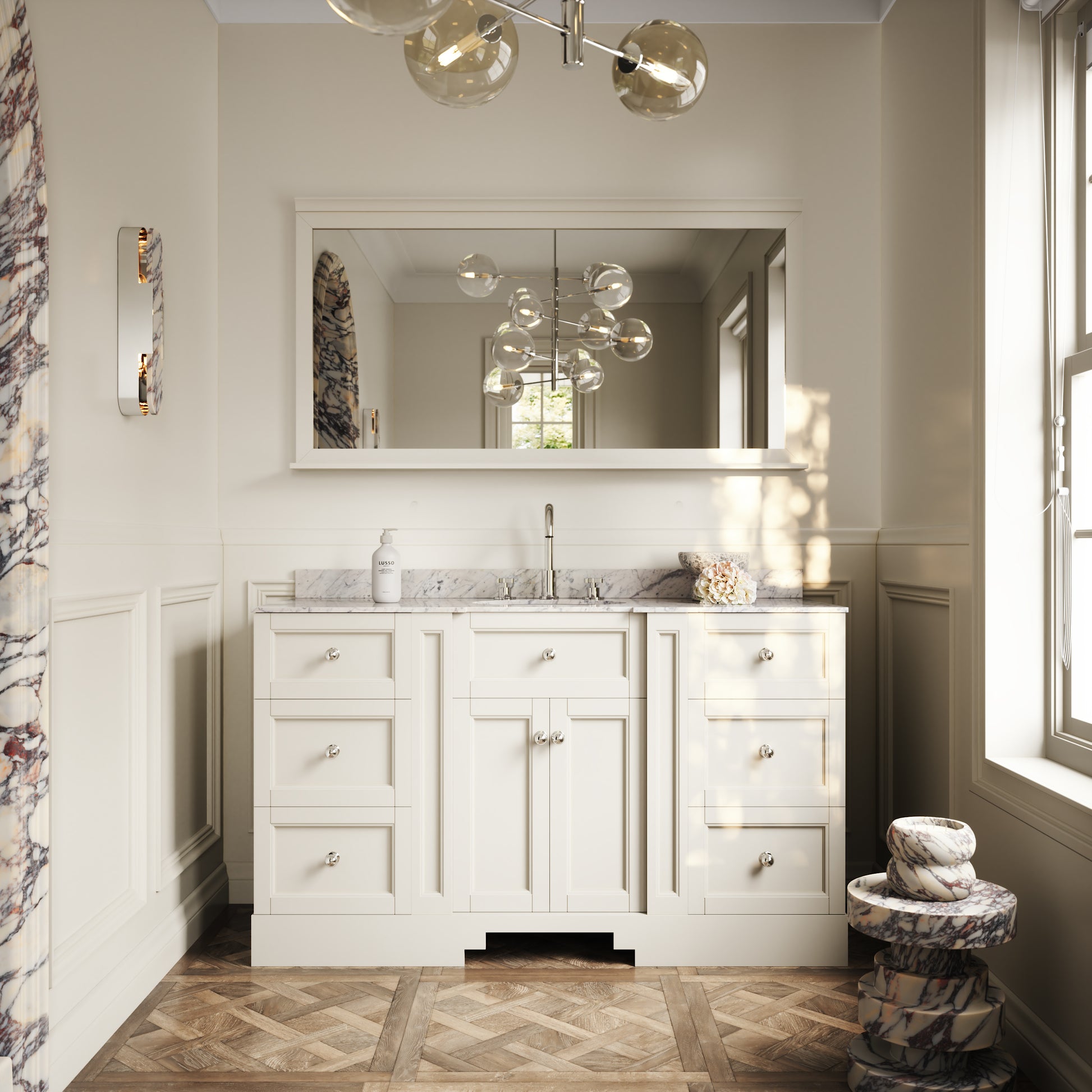 The Eaton Floorstanding Vanity Unit is a seamless blend between traditional and modern bathroom design, featuring a stunning countertop carved from polished Carrara marble with an oval-shaped built-in ceramic basin. This vanity unit is best suited to a family or couple’s bathroom due to its large countertop space and generous storage, designed to achieve clean and uncluttered living.
