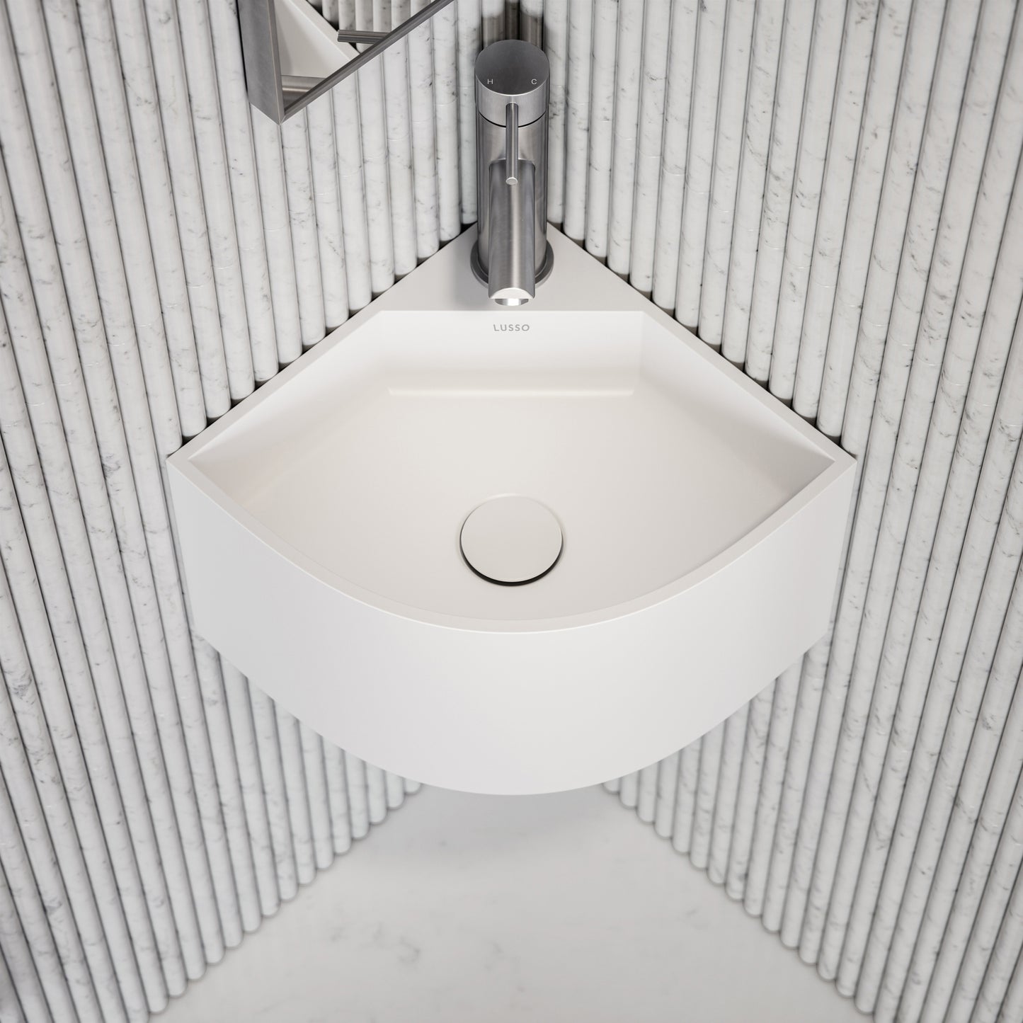 Defined by its compact silhouette of 300 mm in width, corner design and smooth stone resin material, the corner design is suited to modern cloakrooms and small bathrooms.