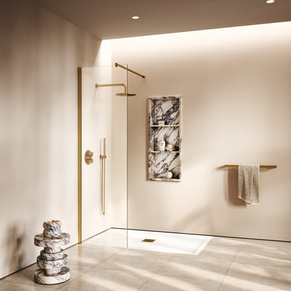 Achieve hotel luxury from the comfort of your own home with the Modular Complete Walk In Shower Enclosure. In our striking brushed gold option, the shower is resemblant to the most luxurious hotels and spas and features a glass panel made from solid, toughened glass. The brushed gold enclosure can be perfectly styled with our brushed gold showers, taps and accessories from the Lusso collection.