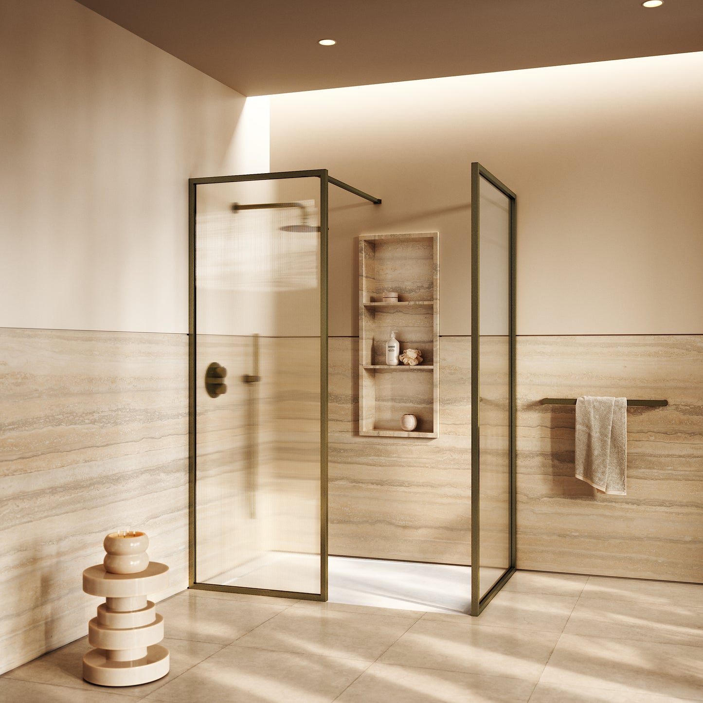 Featuring two reeded glass panels, the enclosure delivers both visual impact and practical protection, their textured surface diffuses light to create a sense of privacy and depth. Framed with our elegant aged bronze finish, the Opulence enclosure enhances your interior with warmth and sophistication, perfectly balancing contemporary minimalism with classic allure. Harmonise further with aged bronze hardware such as our taps, for a cohesive scheme.