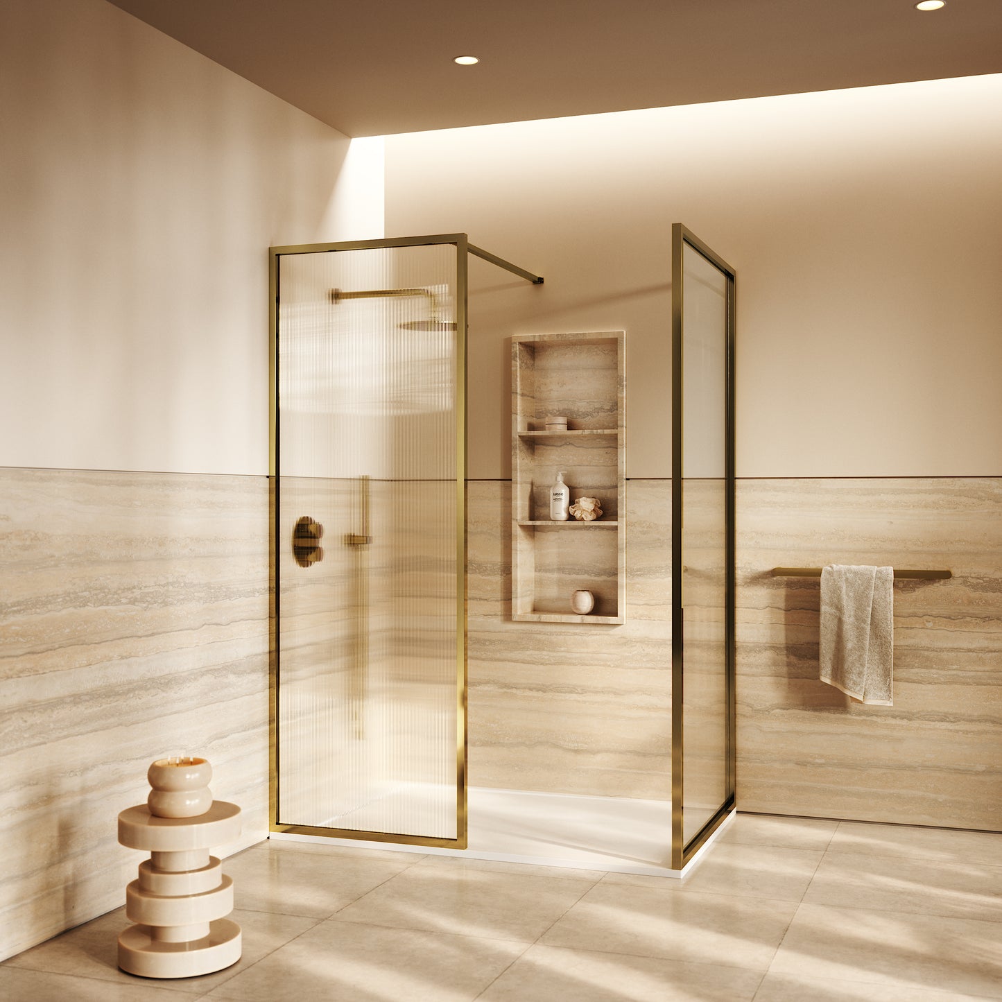 Featuring two reeded glass panels, the enclosure delivers both visual impact and practical protection, their textured surface diffuses light to create a sense of privacy and depth. Framed with our elegant polished brass finish, the Opulence enclosure enhances your interior with warmth and sophistication, perfectly balancing contemporary minimalism with classic allure. Harmonise further with polished brass hardware such as our taps, for a cohesive scheme.