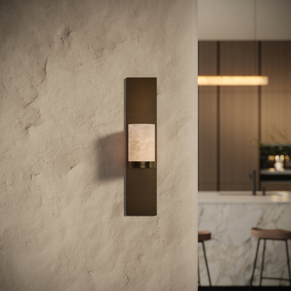 Radiating quiet warmth, the Perluna alabaster LED wall sconce presents a compact curved cylinder mounted on a substantial burnished brass back plate. The soft metallic sheen complements the creamy alabaster, creating a harmonious balance of natural stone and warm metal that feels both contemporary and timeless.