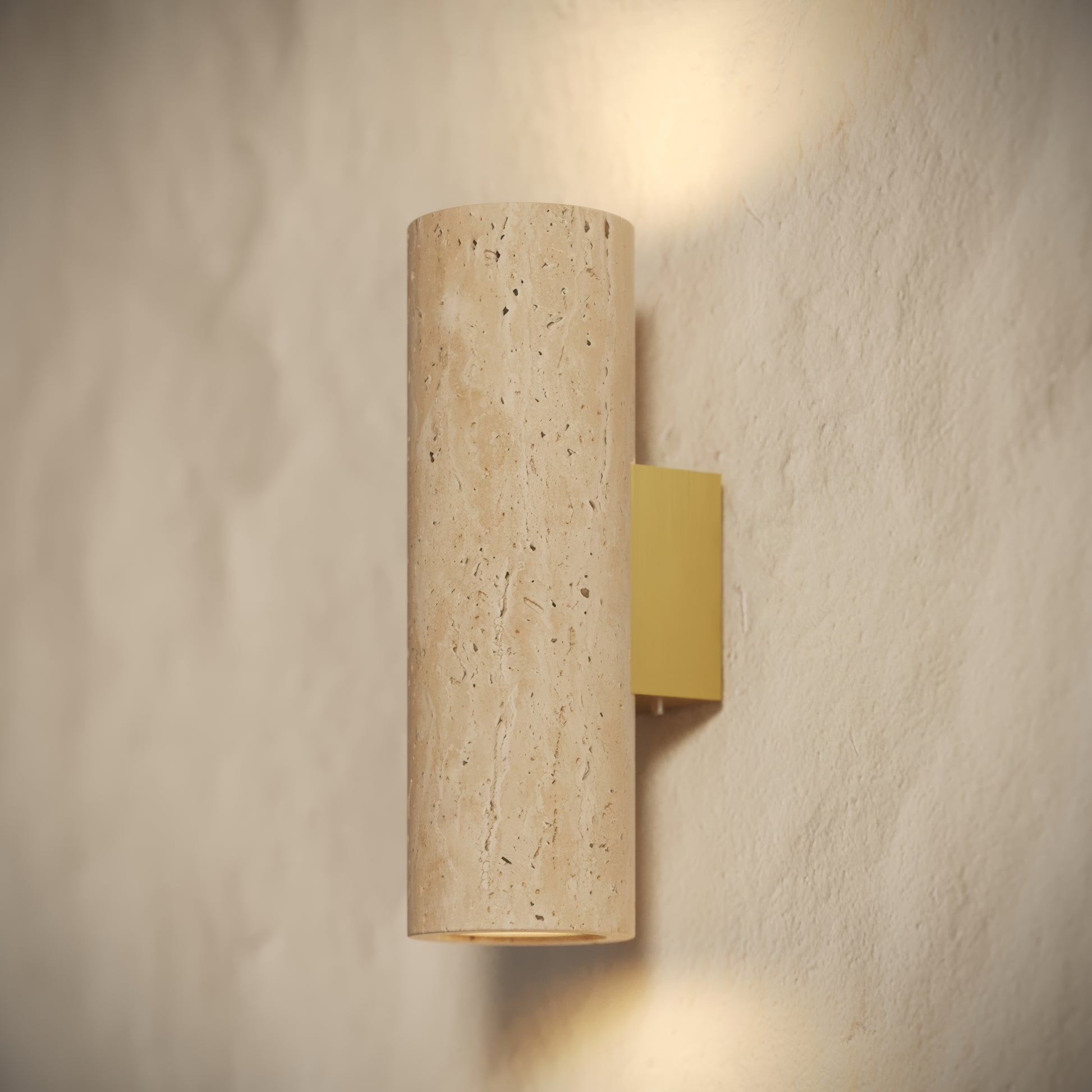 Crafted into a smooth, cylindrical form, the Tesoro Travertine wall sconce light introduces a refined interplay of shape, texture and ambient lighting to your interior.